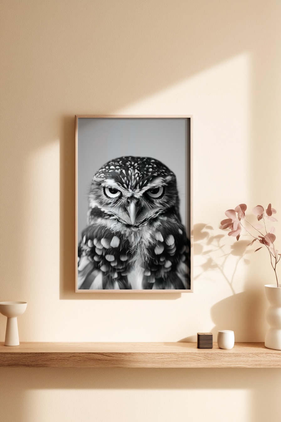 Ein intensiver Blick einer Eule in Schwarz-Weiß. Gedruckt auf halbmattem Papier (170 g/m², FSC-zertifiziert). Die Oberfläche verstärkt die feinen Details der Federn. Wird ungerahmt geliefert – zum Einrahmen oder solo.