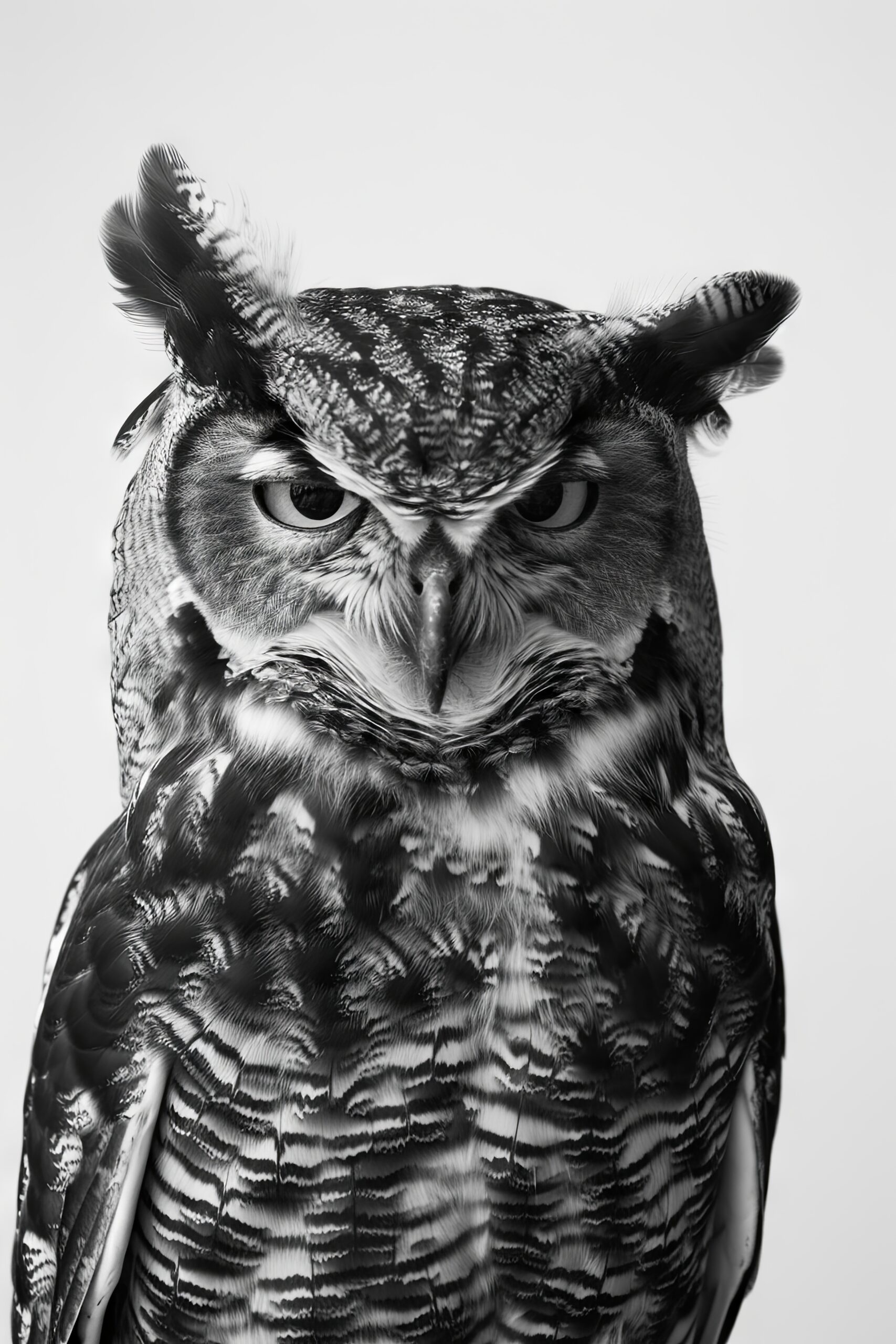 Scharfes Porträt einer Eule in Schwarz-Weiß. Gedruckt auf halbmattem FSC-Papier (170 g/m²). Die matte Oberfläche reduziert Reflexionen. Kommt ungerahmt zum Selbstrahmen oder Solo an die Wand.