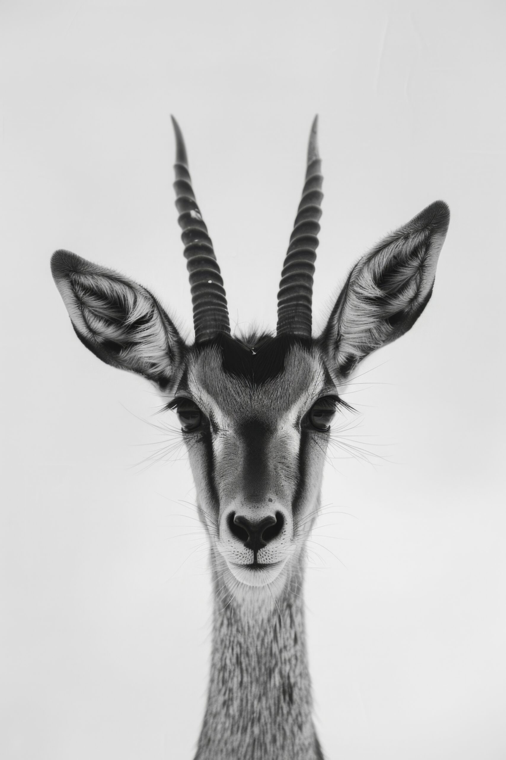 Der Kopf eines Gemsbocks mit deutlich sichtbaren Hörnern und Ohren. Die Aufnahme ist frontal und zeigt detailreich das Gesicht.