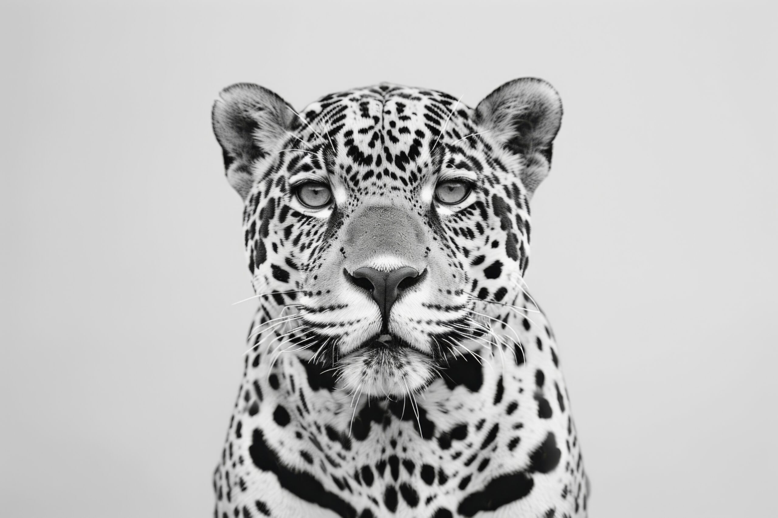 Der Kopf eines Jaguars frontal dargestellt. Klare Details der Fellzeichnung und Gesichtszüge.
