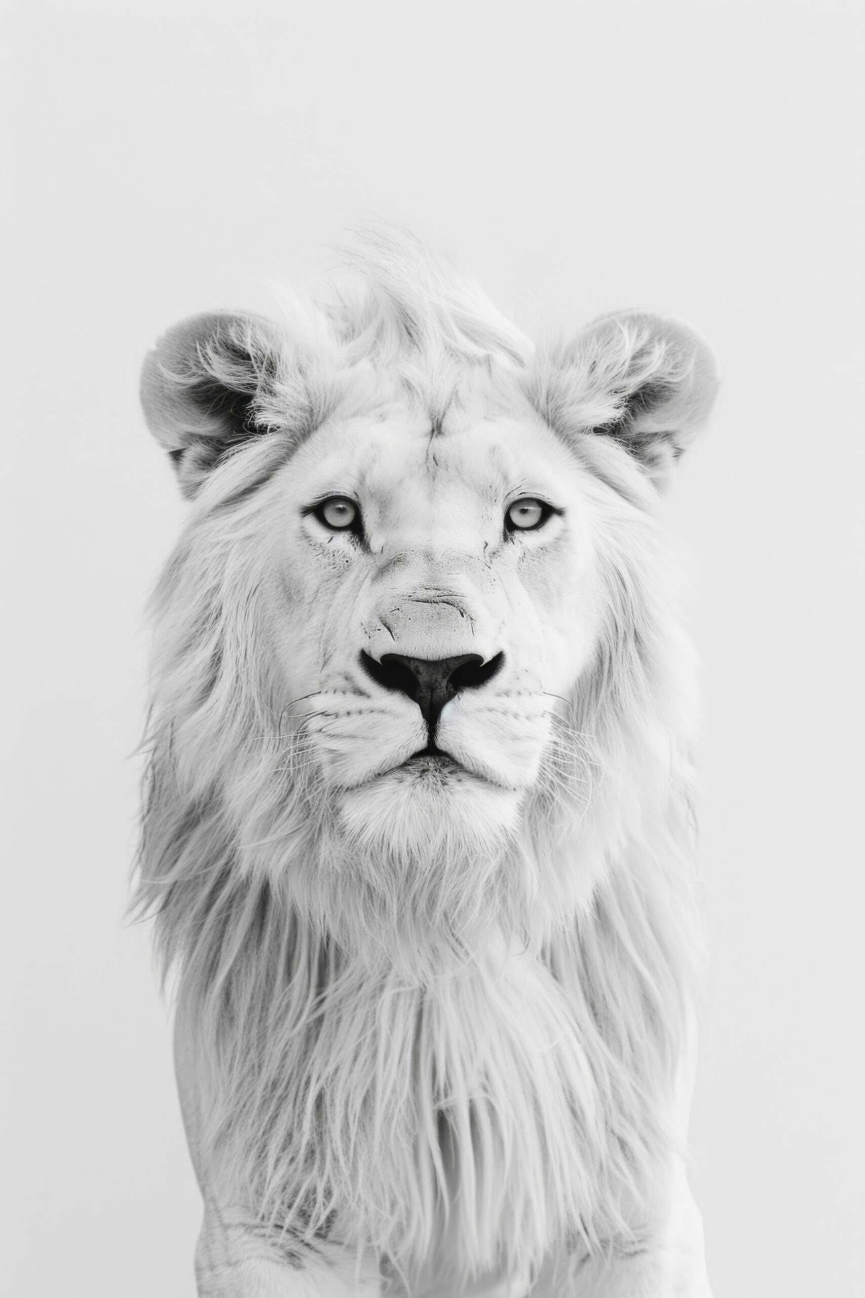 Das helle Fell des Löwen erscheint fast durchsichtig und hebt die feinen Details seiner Mähne und der markanten Gesichtszüge hervor.