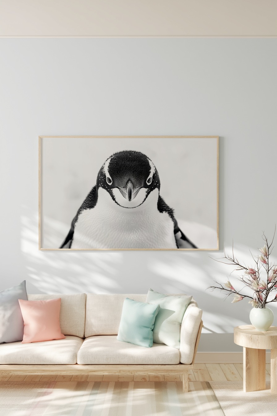 Die scharfen Konturen am Schnabel springen sofort ins Auge. Dieser klare, frontale Blick wirkt fast fordernd. Das schwarz-weiße Gefieder kontrastiert markant zum weißen Hintergrund und gibt dem Motiv eine ehrliche Präsenz.
