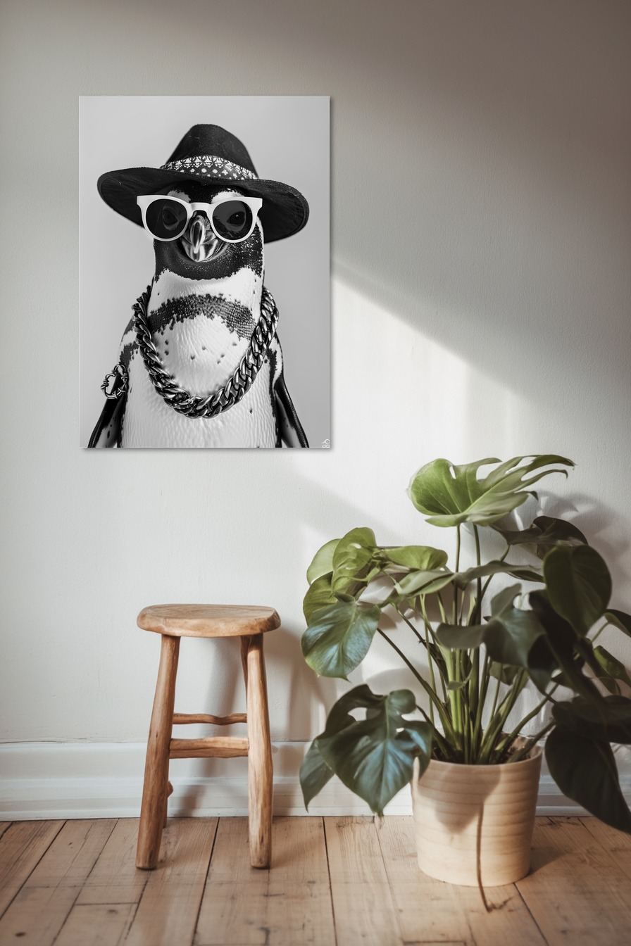 Dieser Pinguin trägt Sonnenbrille, Hut und schwere Kette. Gedruckt auf halbmattem 170 g/m² FSC-Papier mit leichtem Glanz. Ungerahmt zum Selbstrahmen oder Solo an der Wand.