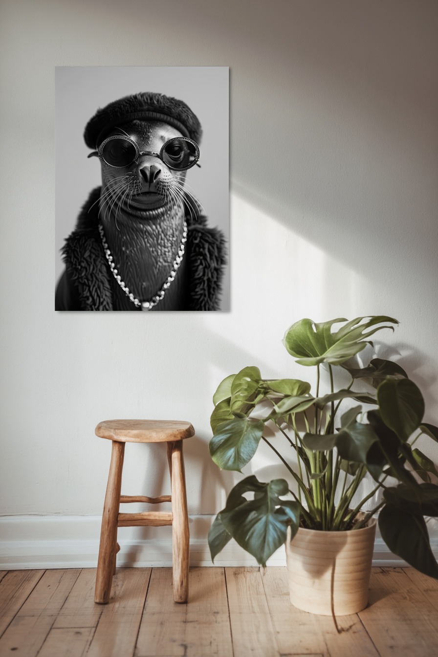 Ein Seehund in Nahaufnahme mit runden Sonnenbrillen. Gedruckt auf halbmattem Papier (170 g/m², FSC-zertifiziert) und ungerahmt geliefert. Die halbglänzende Oberfläche betont die Details und die Textur im Schwarz-Weiß.