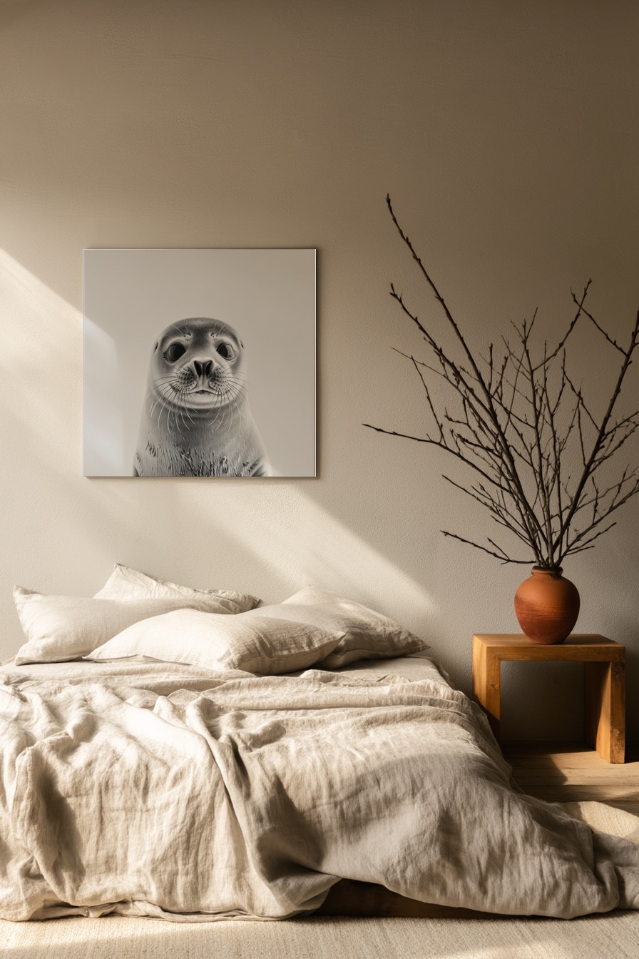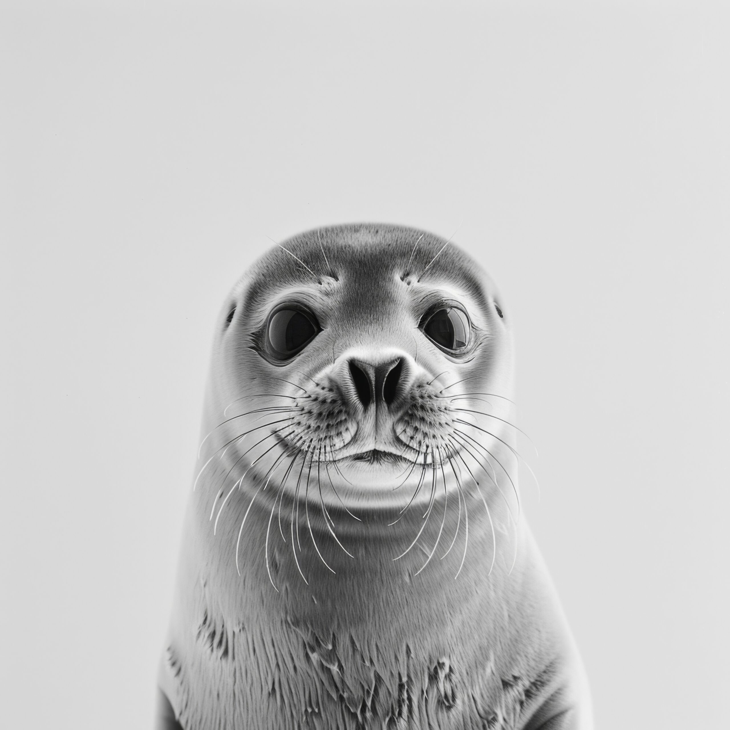 Große, dunkle Augen im Fokus, feine Struktur des Fells sichtbar. Ruhige Präsenz mit klaren Linien und zurückhaltendem Hintergrund. Sanfte Konturen und zarte Barthaare zeichnen das Bild.