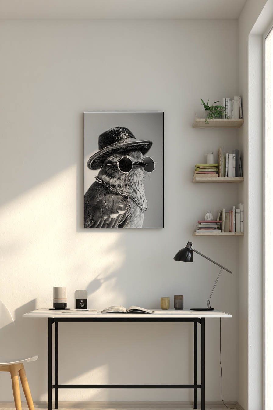 Stiller Moment mit einem Vogel in Sonnenbrille und Hut. Gedruckt auf halbmattem Papier (170 g/m², FSC-zertifiziert) vermittelt es die feine Federstruktur in Schwarz-Weiß. Wird ungerahmt geliefert und eignet sich zum Einrahmen oder als einzelnes Highlight.