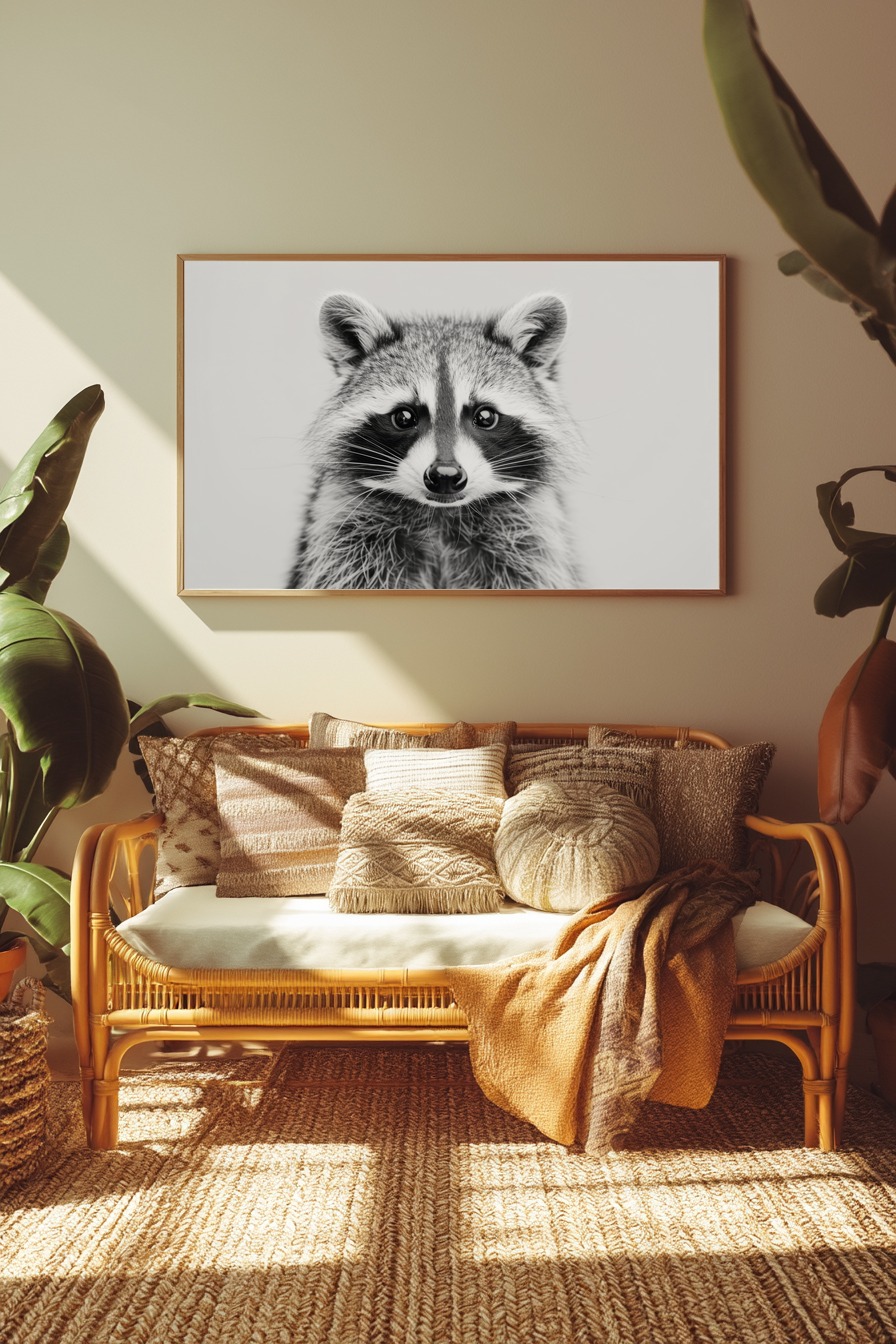 Der Blick des Waschbärs steht im Zentrum, die glänzenden Augen fangen das Licht und wirken fast lebendig. Das feine Fell zeigt feine Struktur, die schwarz-weiße Darstellung verstärkt den Kontrast zwischen den dunklen Augenpartien und dem hellen Gesicht.