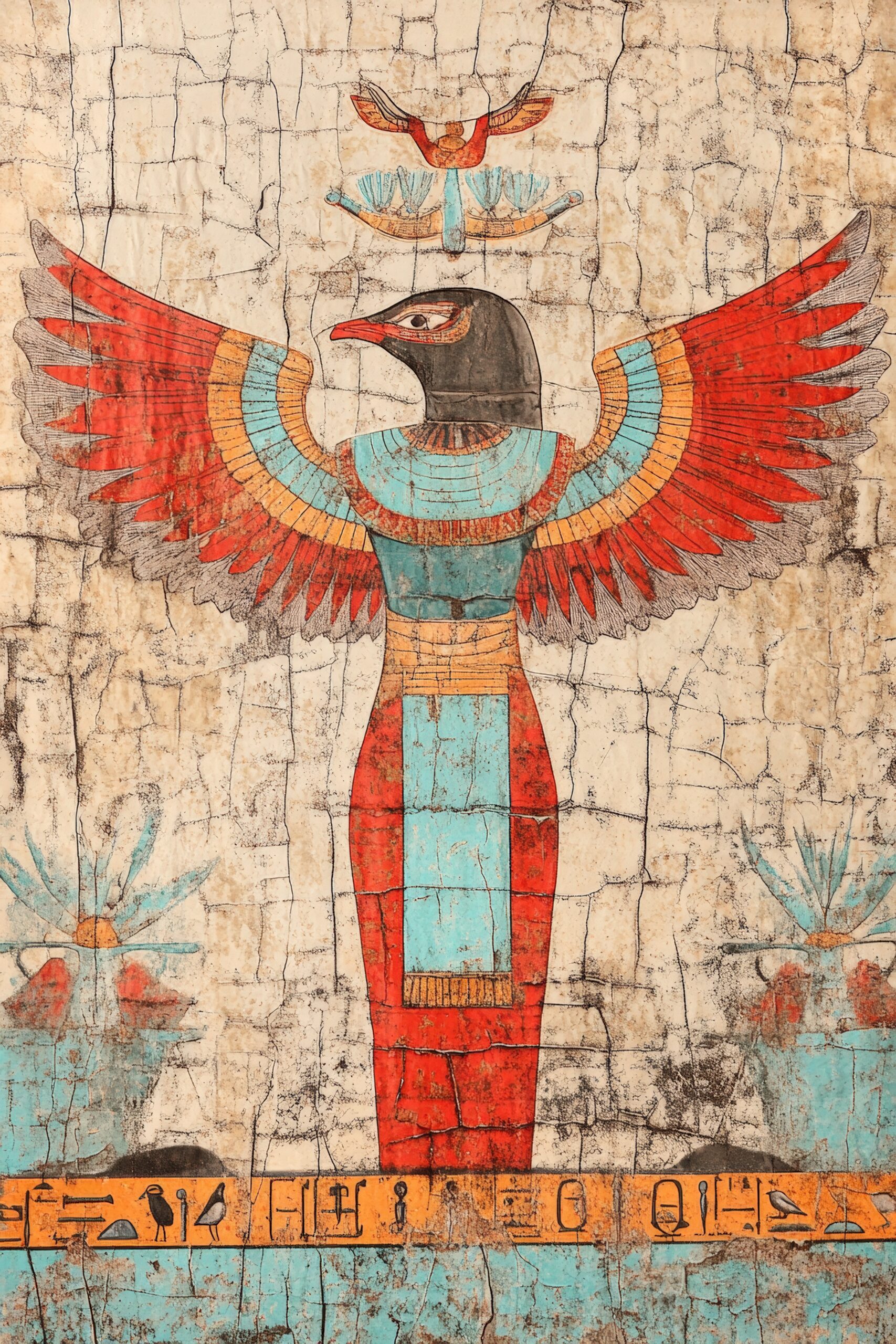 Diese detailreiche Wandmalerei zeigt eine ägyptische Gottheit mit Falkenkopf und ausgebreiteten Flügeln in kräftigen Farben. Die alte Hieroglyphenzeile unterstreicht das historische Motiv.