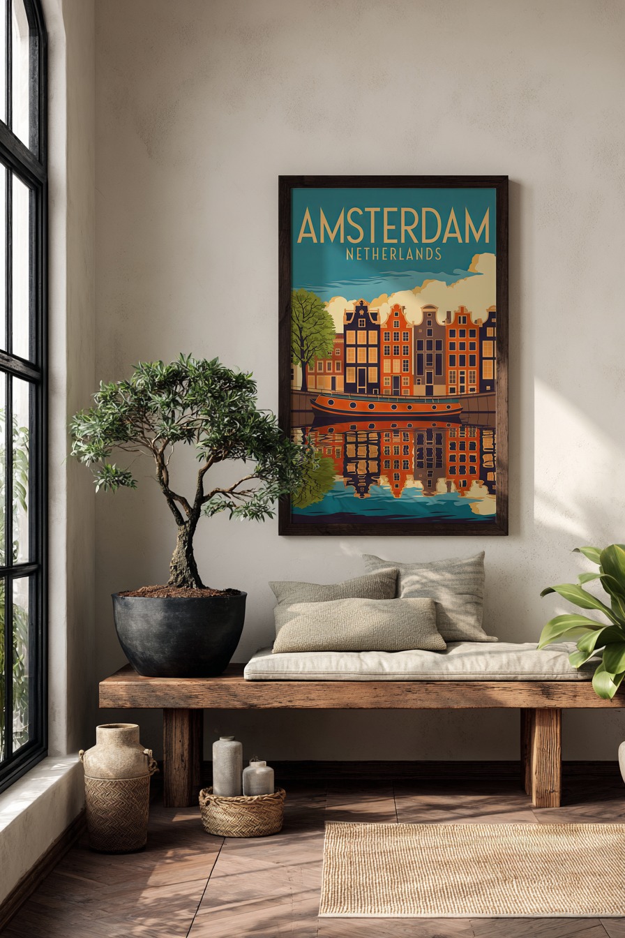Dieses Motiv zeigt die typischen historischen Häuser Amsterdams am Kanal mit einem Boot im Vordergrund. Die Spiegelung im Wasser verstärkt die ruhige Atmosphäre der Szene.
