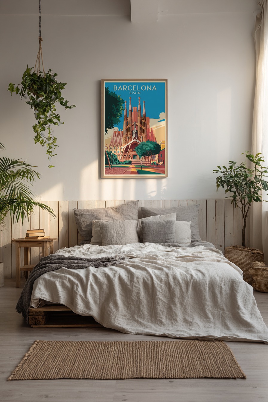 Barcelona und die Sagrada Familia unter klarem Himmel. Gedruckt auf halbmattem 170 g/m² FSC-Papier, das mit leichtem Glanz die Farben hebt. Das Poster kommt ungerahmt, ideal zum Selbstgestalten.