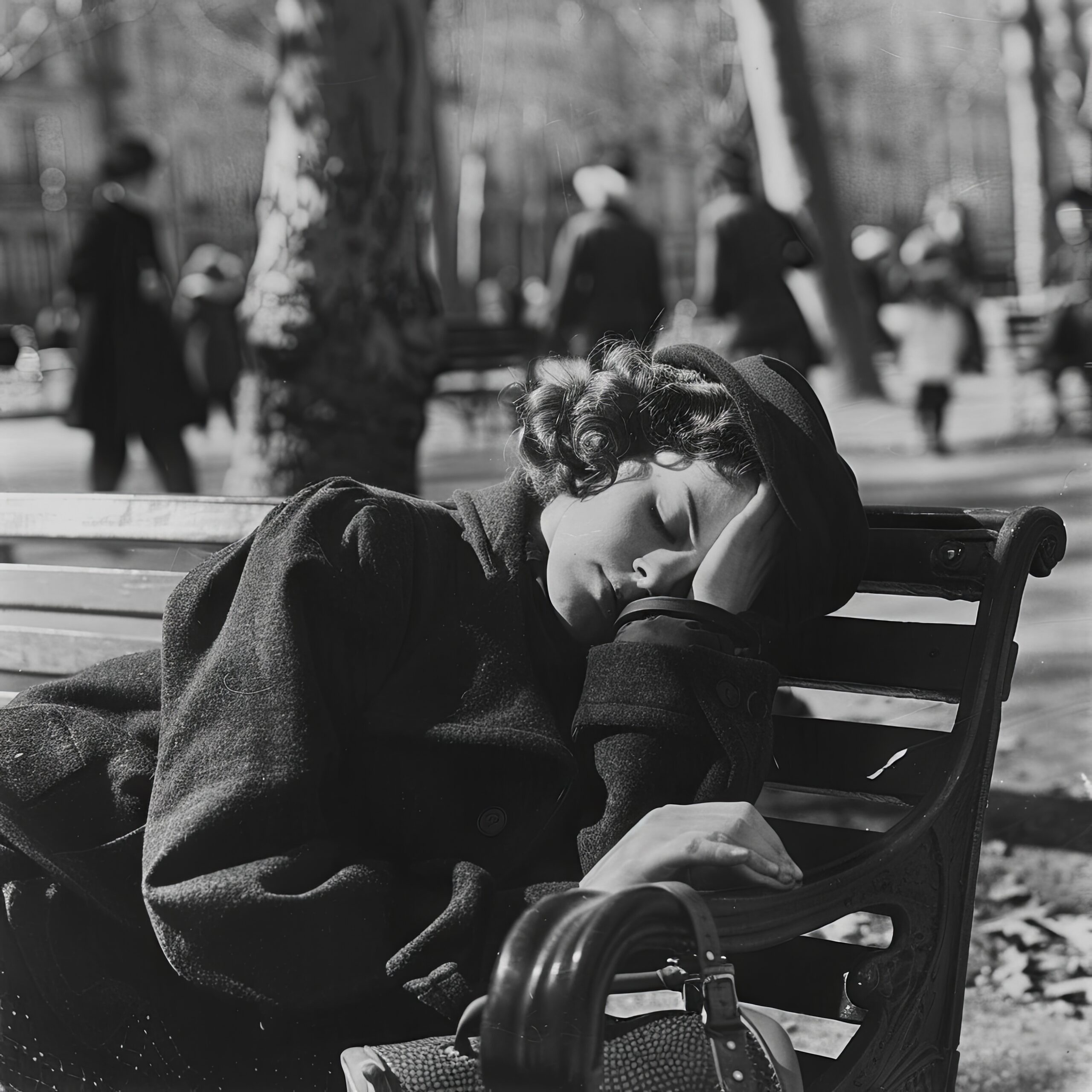Die Hand stützt den Kopf mit Nachdruck, als wolle sie den Moment festhalten. Kontraste schaffen eine klare Trennung zwischen Ruhe und dem lebhaften Gelände im Hintergrund.