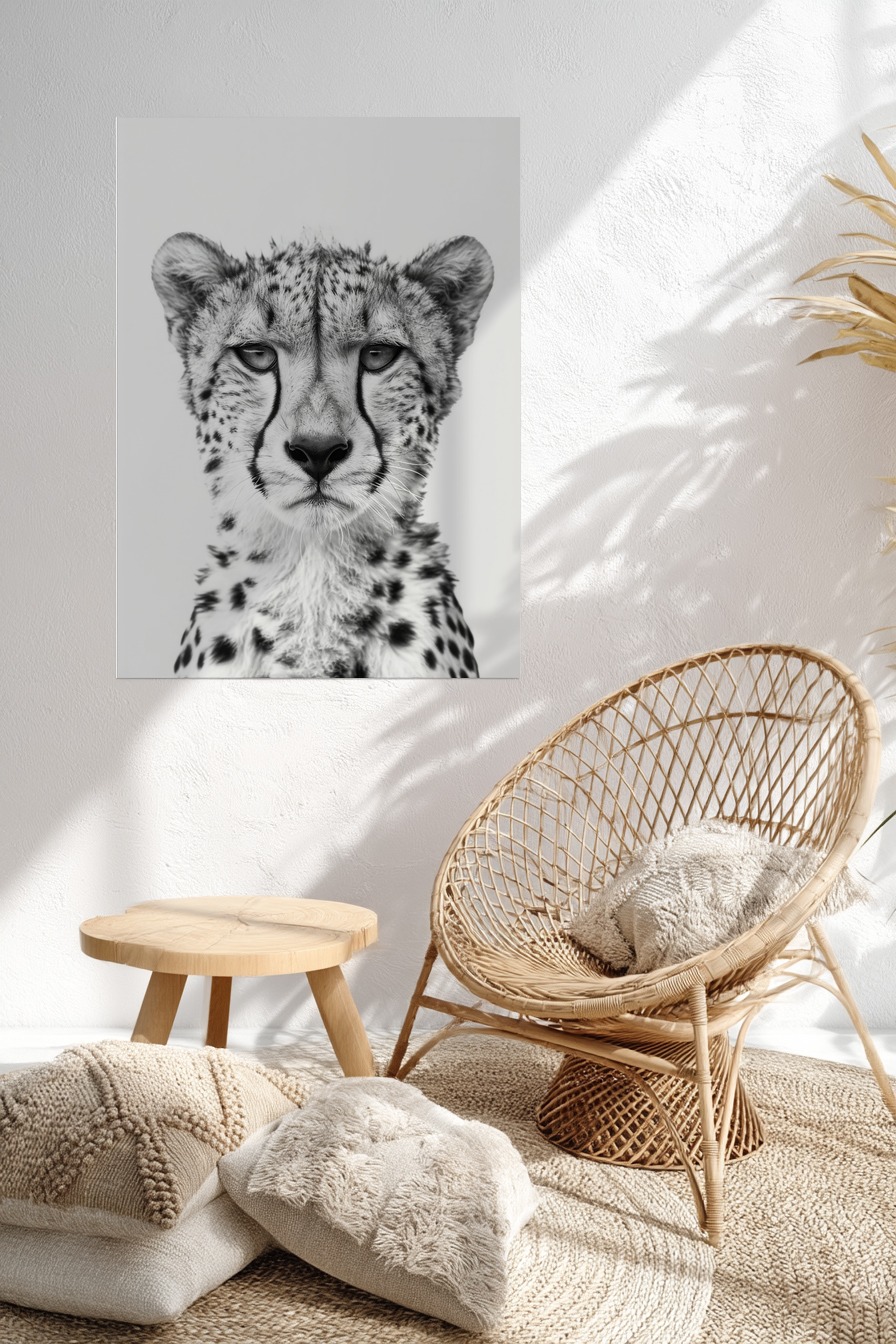 Schwarze Linien umrahmen die scharfen Augen, klare Details in jedem Fellbüschel. Direkt, unverhohlen, der Blick nimmt alles ein. Reduziert auf das Wesentliche, streng und fokussiert.