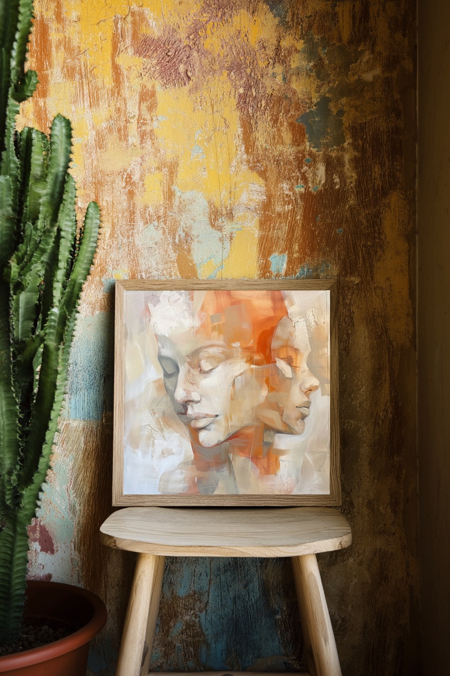 Zwei weibliche Gesichter sind überlagert mit weich verlaufenden Farbübergängen in Orange und Grau.