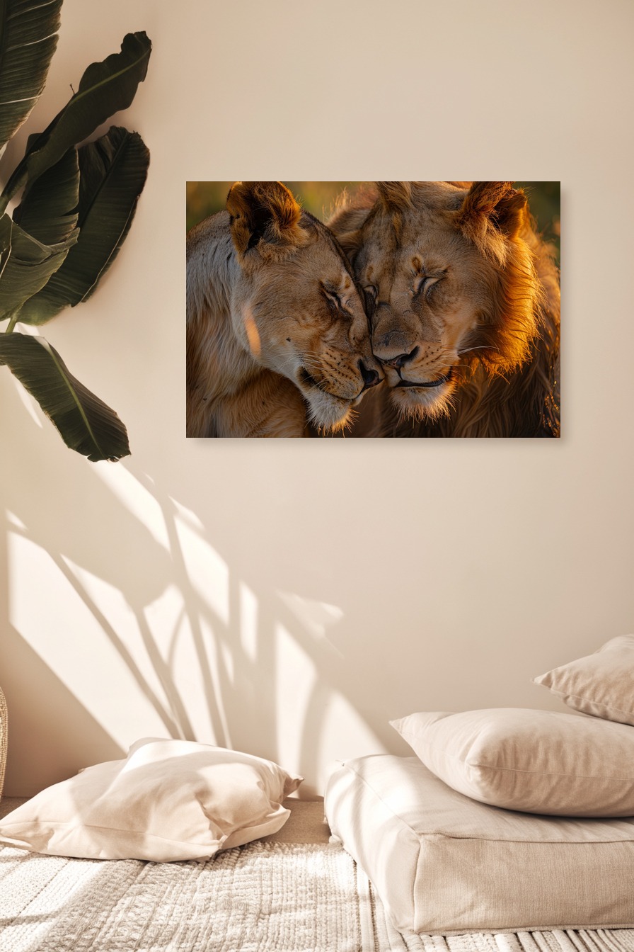 Stille Nähe zwischen zwei Löwen in warmem Licht. Gedruckt auf halbmattem Papier (170 g/m², FSC-zertifiziert). Die Oberfläche verstärkt die warmen Farben dezent. Wird ungerahmt geliefert – zum selbst Einrahmen oder solo.