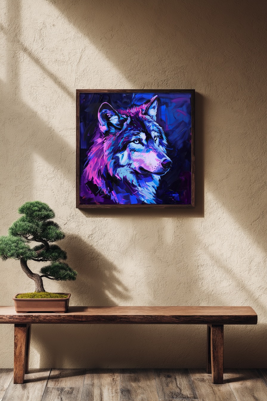 Ein Wolfsporträt in leuchtenden Blau- und Pinktönen. Gedruckt auf halbmattem Papier mit dezenter Reflexion. Wird ungerahmt geliefert, zum selbst Einrahmen oder solo an der Wand.