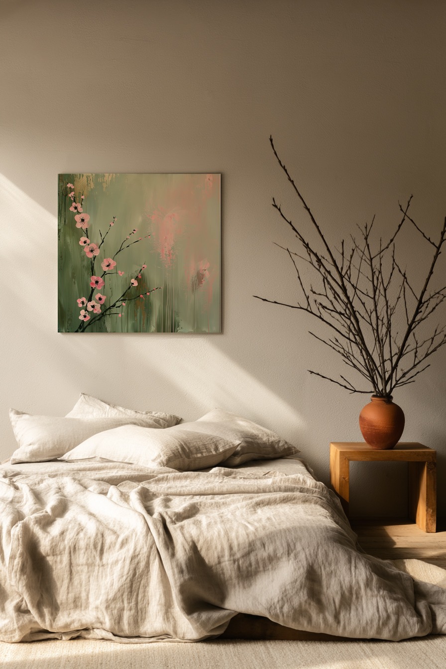 Schmaler Zweig mit mehreren kleinen rosa Kirschblüten. Schwarze Stiele und Knospen an den Zweigenden.