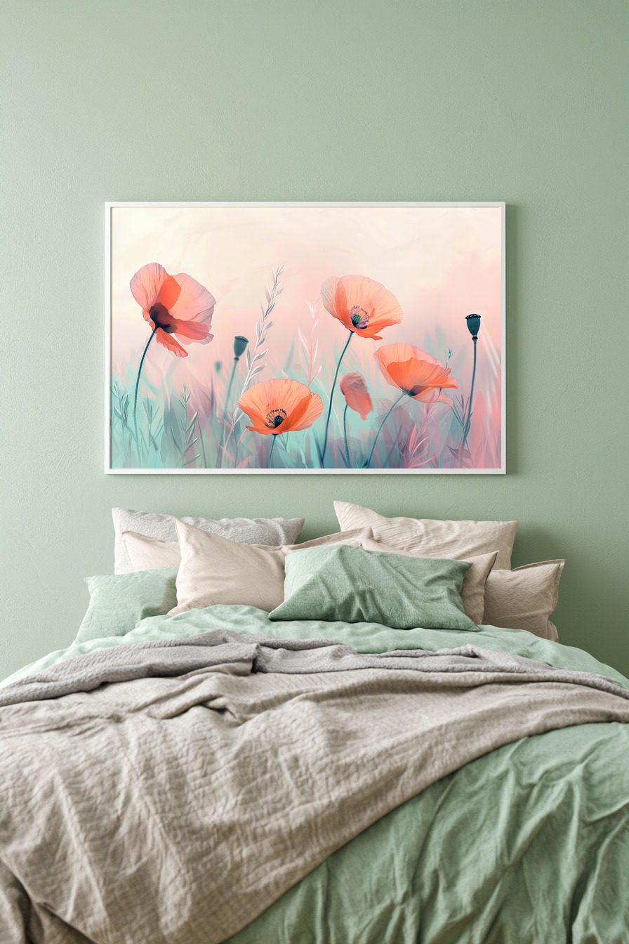 Die zarten Blütenblätter schimmern leicht durchscheinend und fangen das sanfte Licht ein. Leicht gebogene Stiele tanzen zwischen grasartigen Blättern, das Gesamtbild wirkt luftig und filigran. Farbverläufe in Rosa und Koralle verschmelzen mit den kühlen Grüntönen der Umgebung.