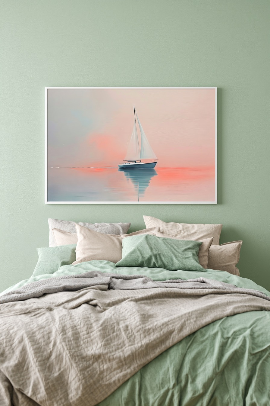 Die klare, scharfe Kante der Segel hebt sich markant vom sanften Farbverlauf des Wassers ab. Das Spiel aus Reflexion und Licht erzeugt einen fast surrealen Eindruck. Dieses Motiv strahlt Ruhe und Präzision zugleich aus.