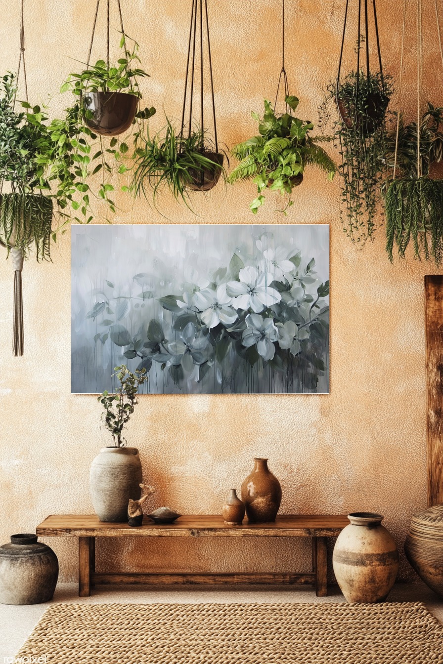 Jede Blüte zeigt feine Pinselstriche und Details auf den Blättern. Das Bild schafft eine kühle, fast neblige Atmosphäre mit leicht verblassenden Formen.