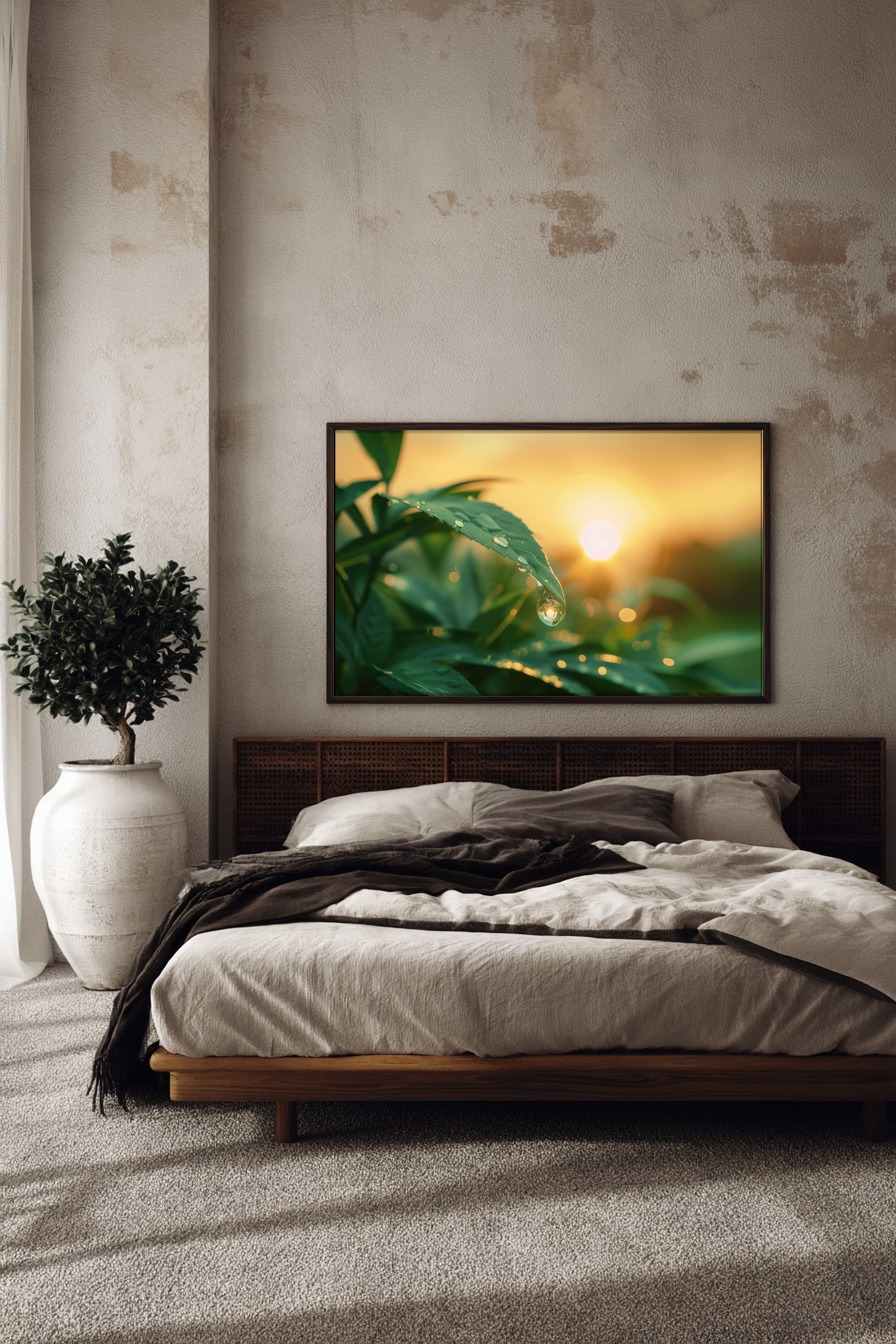 Ein einzelner Tautropfen hängt an einem Blatt. Die Sonne steht tief am Horizont.