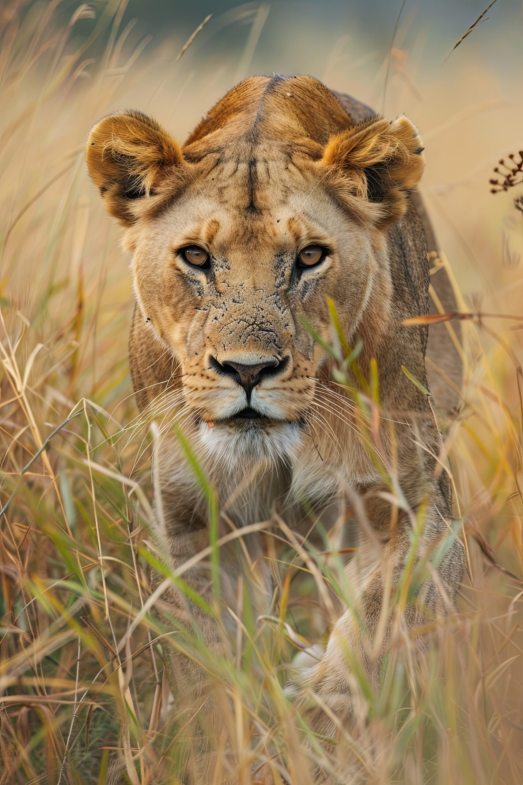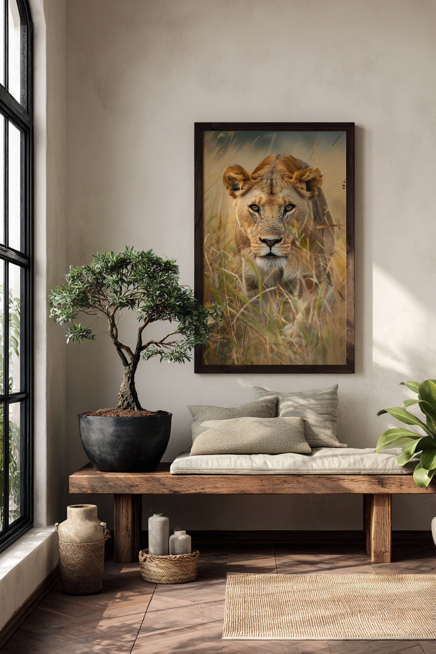 Eine Löwin steht ruhig im hohen Gras. Gedruckt auf halbmattem Papier (170 g/m², FSC-zertifiziert) mit dezenter Oberflächenstruktur. Wird ungerahmt geliefert – zum selbst Einrahmen oder solo an der Wand.
