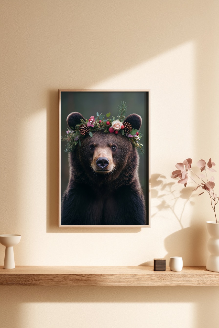 Ein ruhiges Porträt eines braunen Bären mit einem Kranz aus Kiefernzweigen, Tannenzapfen und Blüten auf dem Kopf. Gedruckt auf halbmattem 170 g/m² FSC-Papier, das die natürlichen Farben klar darstellt. Wird ungerahmt geliefert, ideal zum selbst Einrahmen oder als Hingucker allein an der Wand.