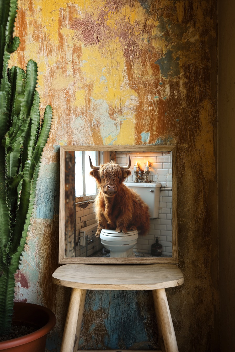 Ein Highland Rind sitzt auf einer Toilette in einem altmodischen Badezimmer. Gedruckt auf halbmattem 170 g/m² FSC-Papier. Wird ungerahmt geliefert zum individuellen Einrahmen.
