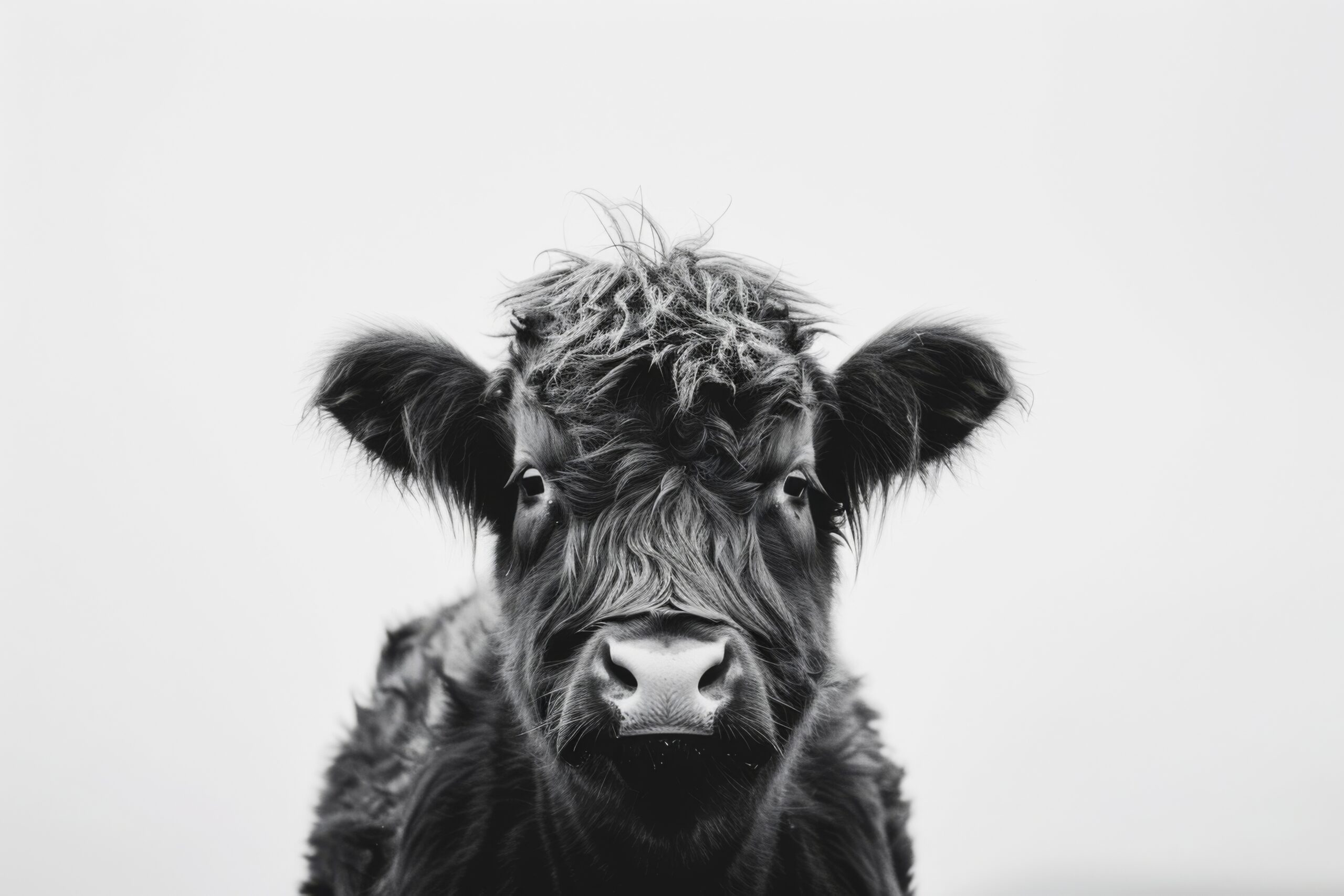 Die feine Struktur des Fells offenbart lebendige Details und bringt das Kalb fast zum Greifen nah. Jedes Haar scheint klar konturiert, während der monochrome Ton dem Bild Tiefe verleiht.