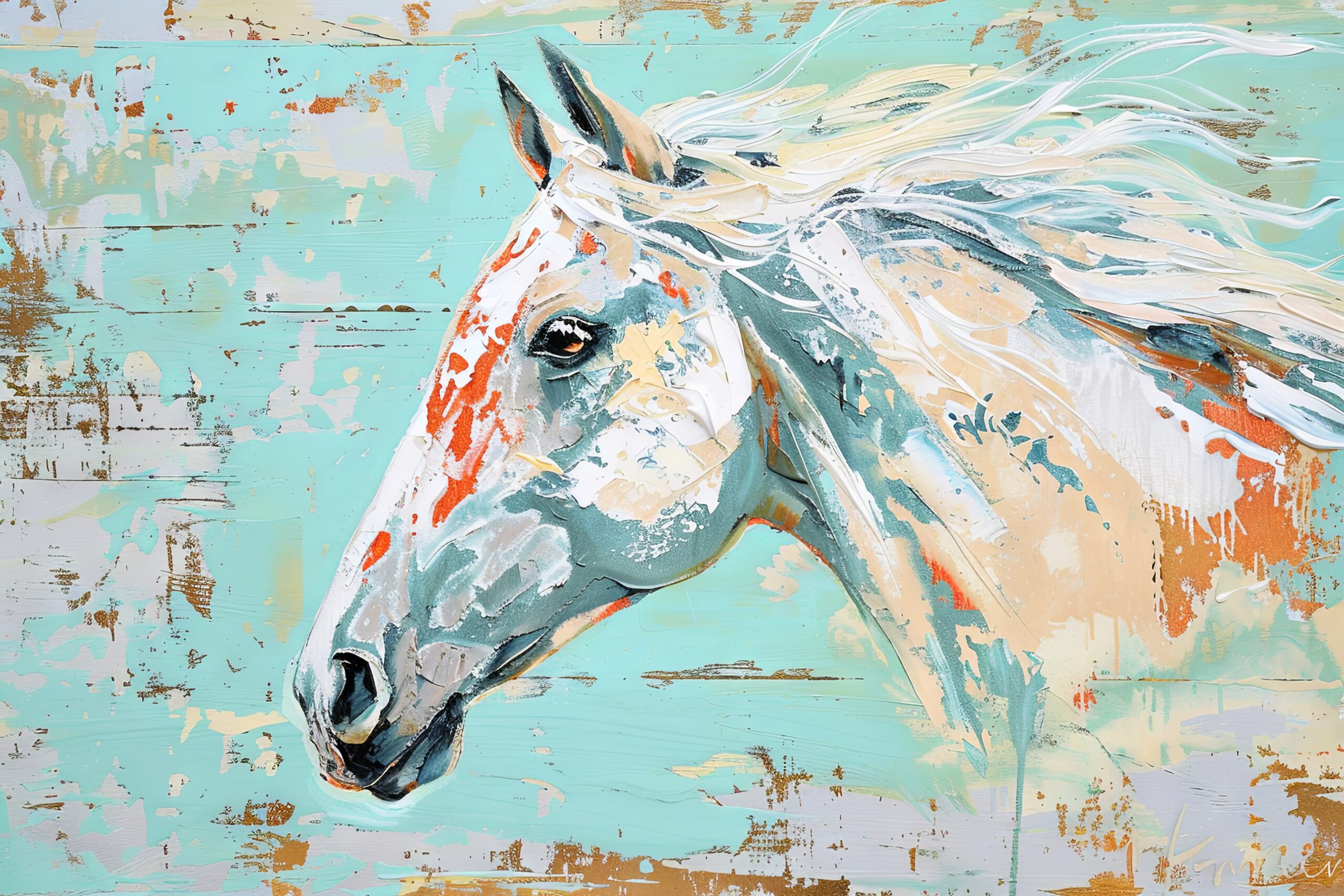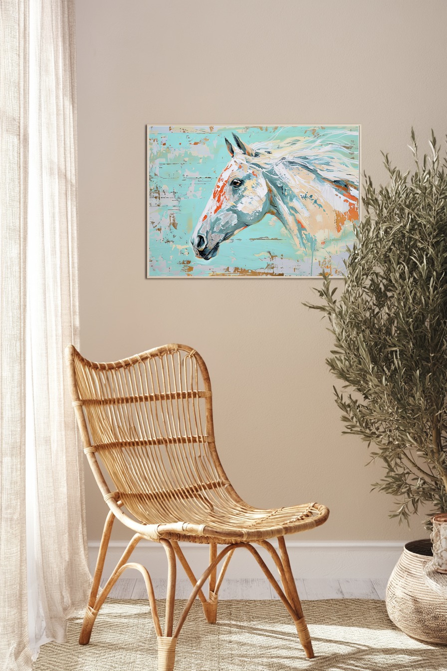 Sanfte Präsenz eines Pferdekopfs in lebendigen Farben. Gedruckt auf halbmattem 170 g/m² FSC-Papier. Die Oberfläche betont die kräftigen und dezenten Farbübergänge. Kommt ungerahmt, passt in ruhige und lebendige Räume.