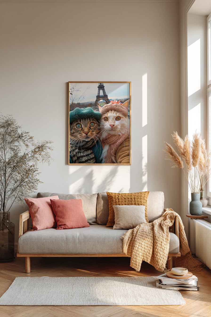 Zwei Katzen mit Strickmütze und Schal vor dem Eiffelturm. Gedruckt auf halbmattem 170 g/m² FSC-Papier. Kommt ungerahmt, zum selbst Einrahmen oder solo an die Wand.