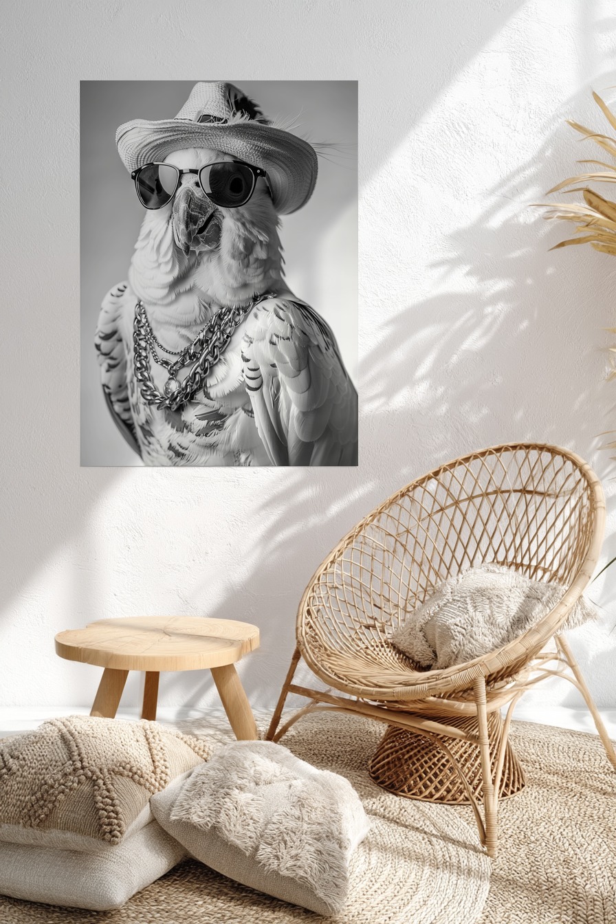 Dieses Bild zeigt einen Papagei mit Sonnenhut, Sonnenbrille und modischen Ketten. Die schwarz-weiße Darstellung hebt die Textur des Gefieders und die Accessoires hervor.