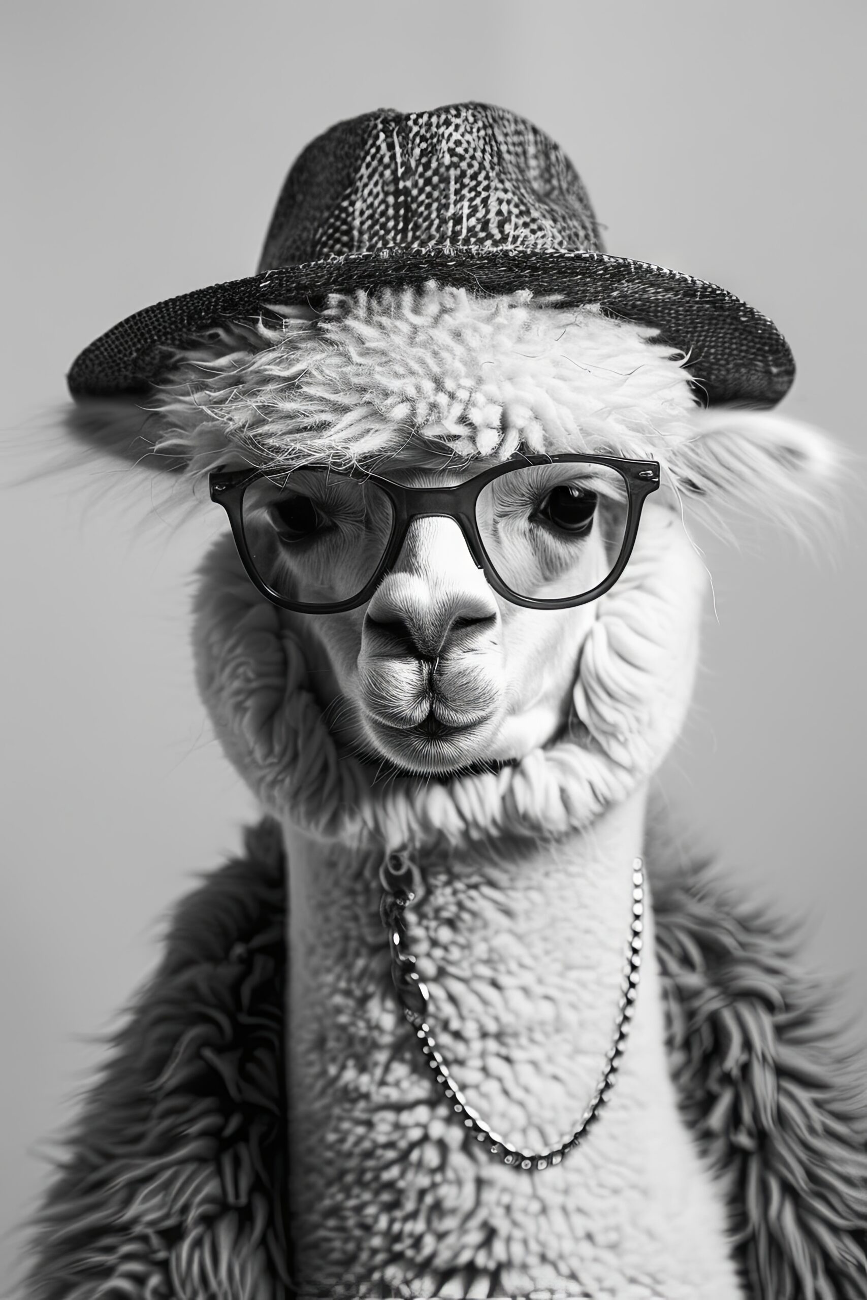 Fotografie Poster Alpaka schwarz-weiß Porträt Hut Brille