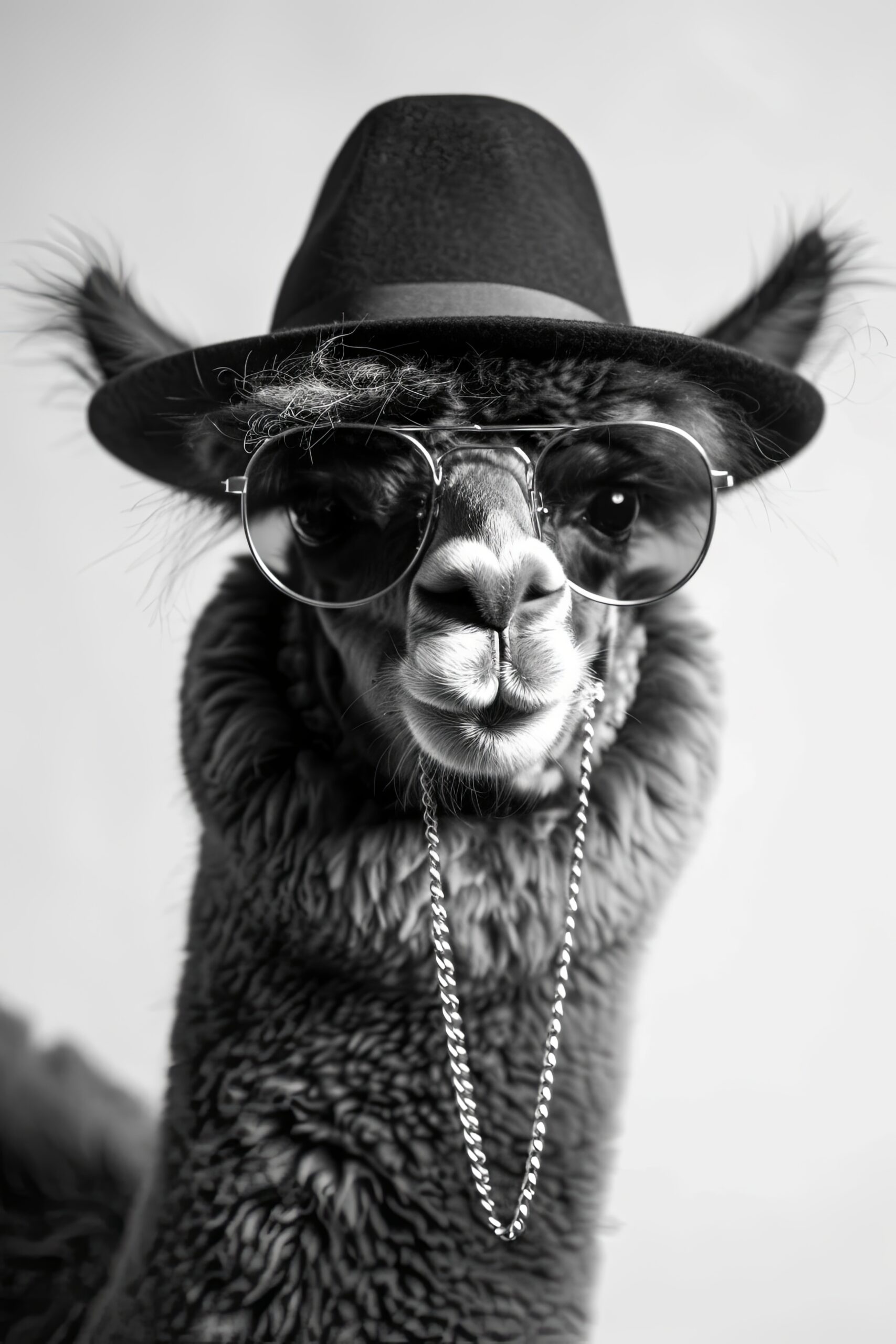 Nahaufnahme eines Alpakas mit Hut und Sonnenbrille in Schwarz-Weiß. Gedruckt auf halbmattem Papier (170 g/m², FSC-zertifiziert). Wird ungerahmt geliefert.