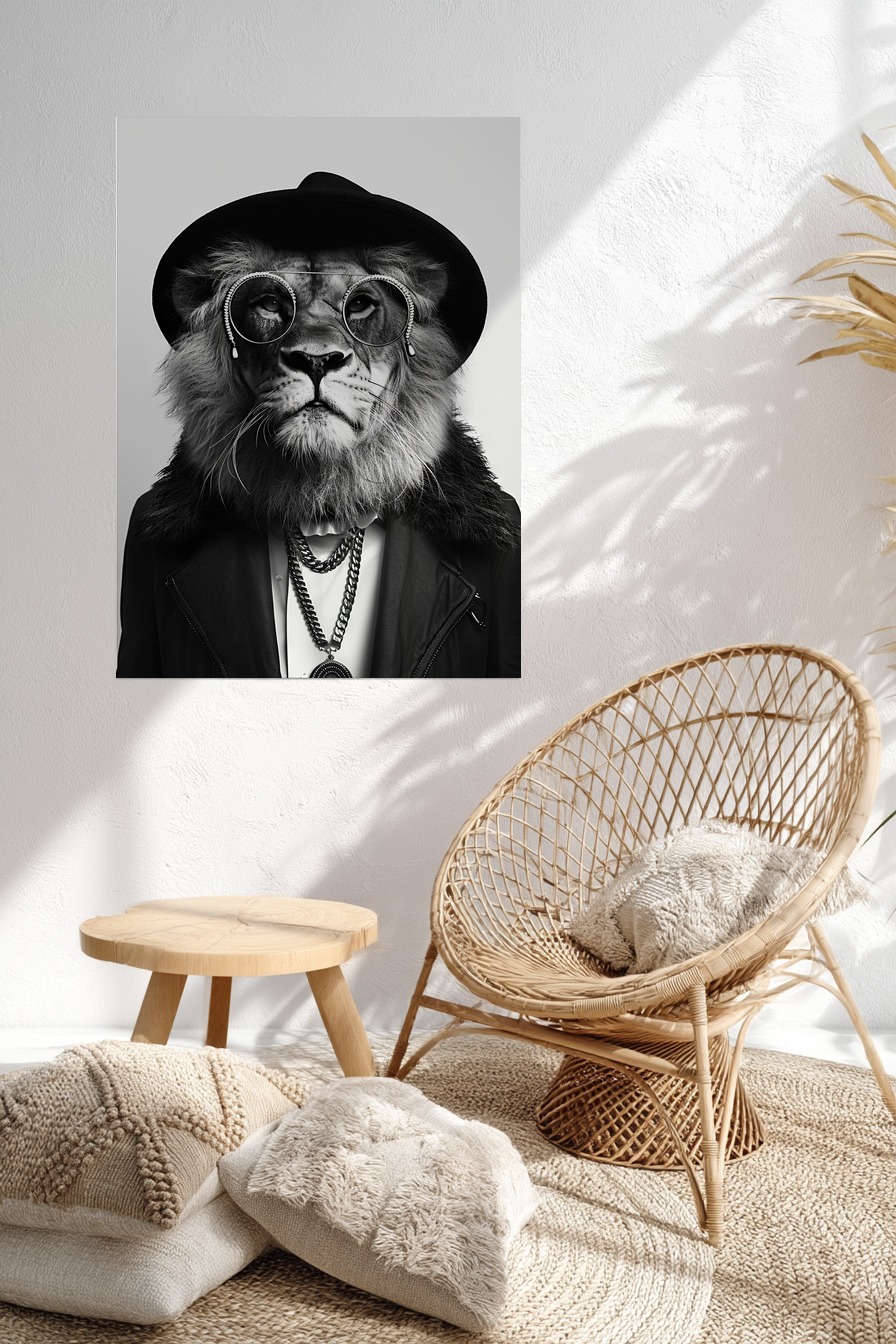 Fotografie Poster Löwe Hut Brille schwarz-weiß