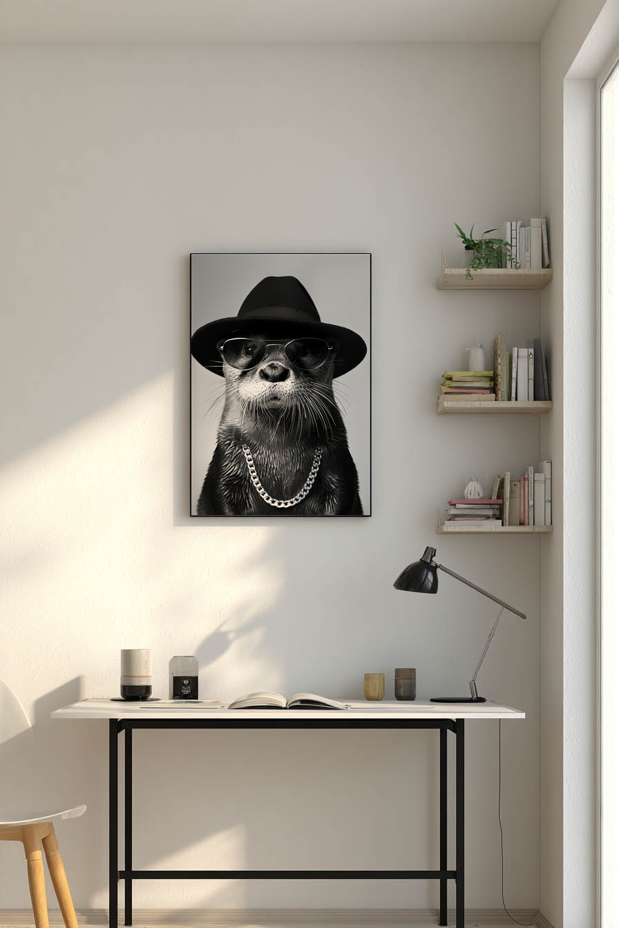 Ein Otter mit Hut und Sonnenbrille in Schwarz-Weiß. Gedruckt auf halbmattem Papier (170 g/m², FSC-zertifiziert). Die Oberfläche betont Kontraste ohne Spiegelung. Wird ungerahmt geliefert – zum selbst Einrahmen oder als Solist.