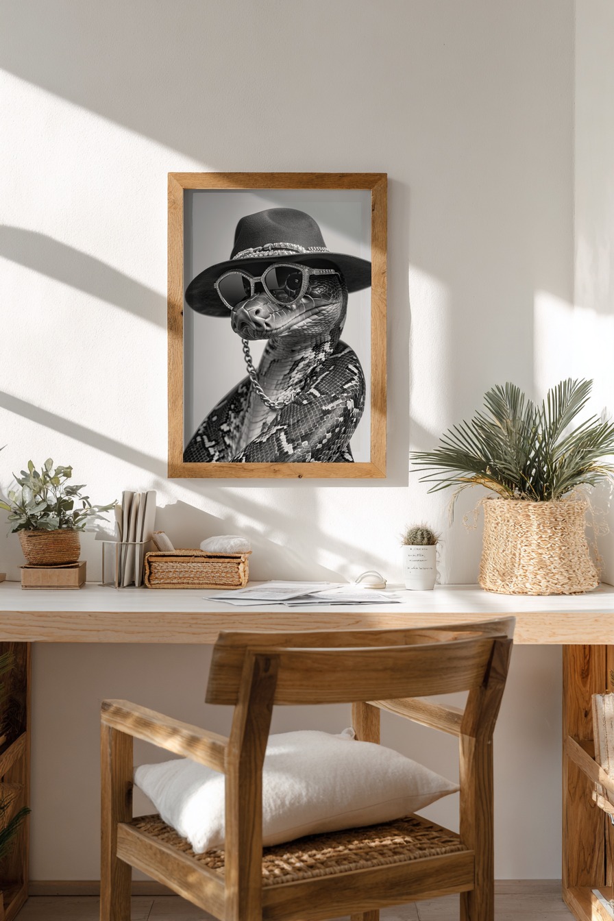 Eine Schlange trägt Hut, Sonnenbrille und Kette. Gedruckt auf halbmattem Papier (170 g/m², FSC-zertifiziert), die Oberfläche verleiht einen dezenten Glanz. Wird ungerahmt geliefert – zum selbst Einrahmen oder solo an die Wand.
