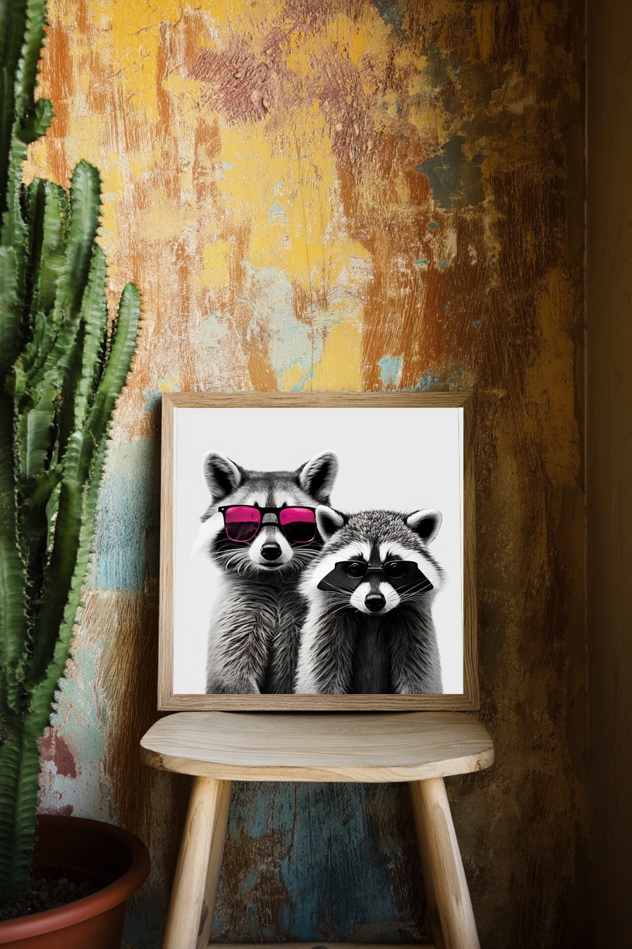 Zwei Waschbären frontal, beide mit Sonnenbrille. Gedruckt auf halbmattem 170 g/m² FSC-Papier. Wird ungerahmt geliefert zum Selbstrahmen.