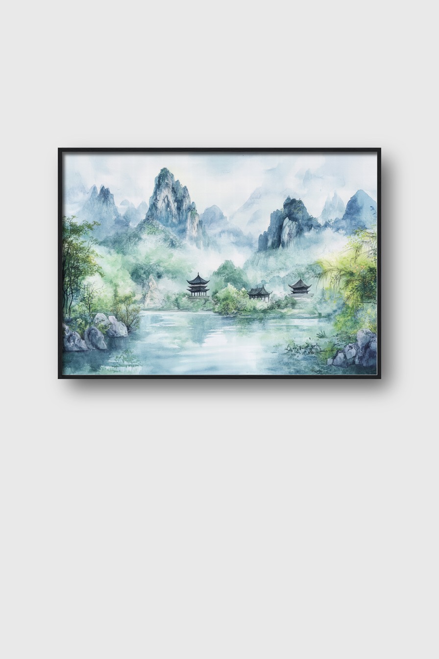 Wasserfarben Poster einer nebligen Berglandschaft mit traditionellen Pagoden am Ufer, ruhiger asiatischer Kunstdruck in Grüntönen und Blautönen