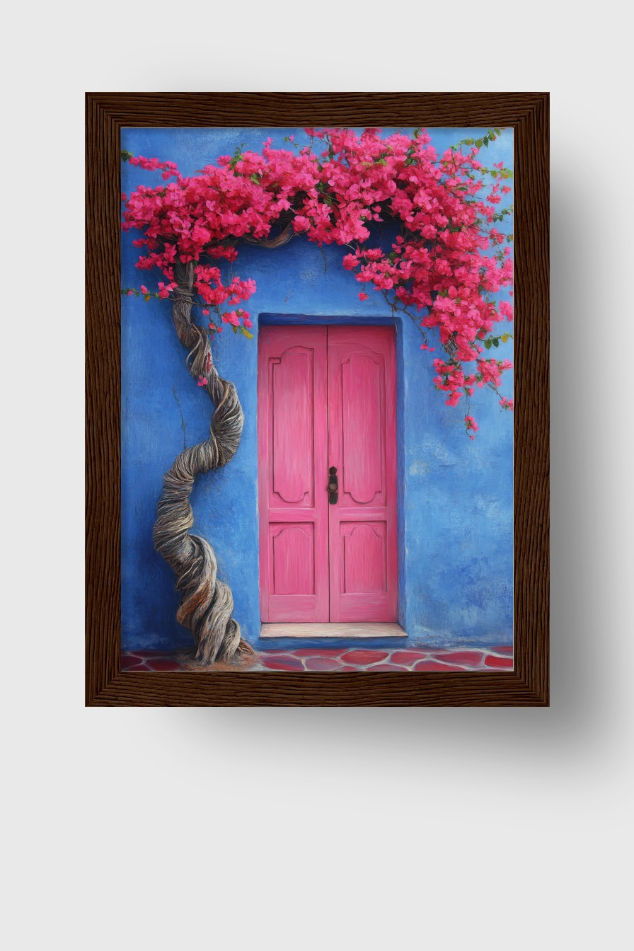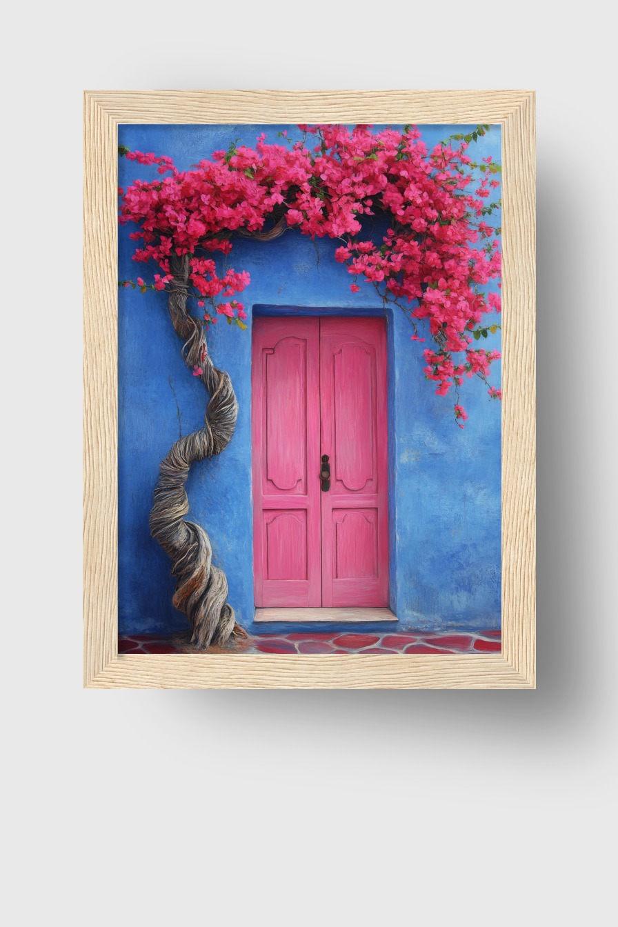Das Bild zeigt eine rosafarbene Tür mit blühender Bougainvillea. Auf halbmattem Posterpapier (170 g/m²) hinter bruchsicherem Plexiglas in einem FSC-zertifizierten Kiefernholzrahmen. Erhältlich in Schwarz, Weiß, Naturholz und Dunkelbraun. Fertig zum Aufhängen, inklusive Aufhängeset.