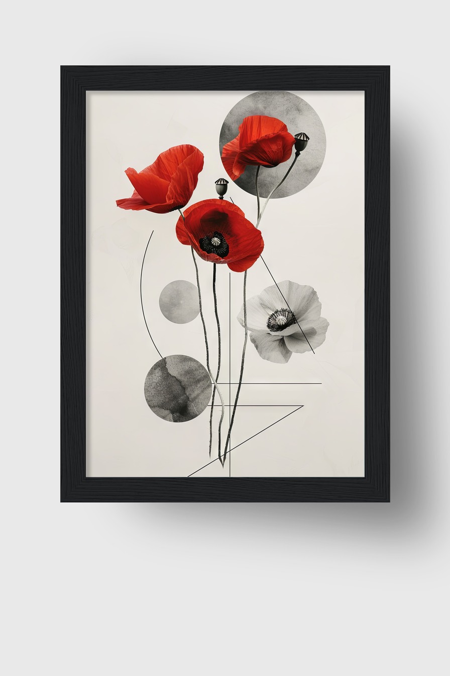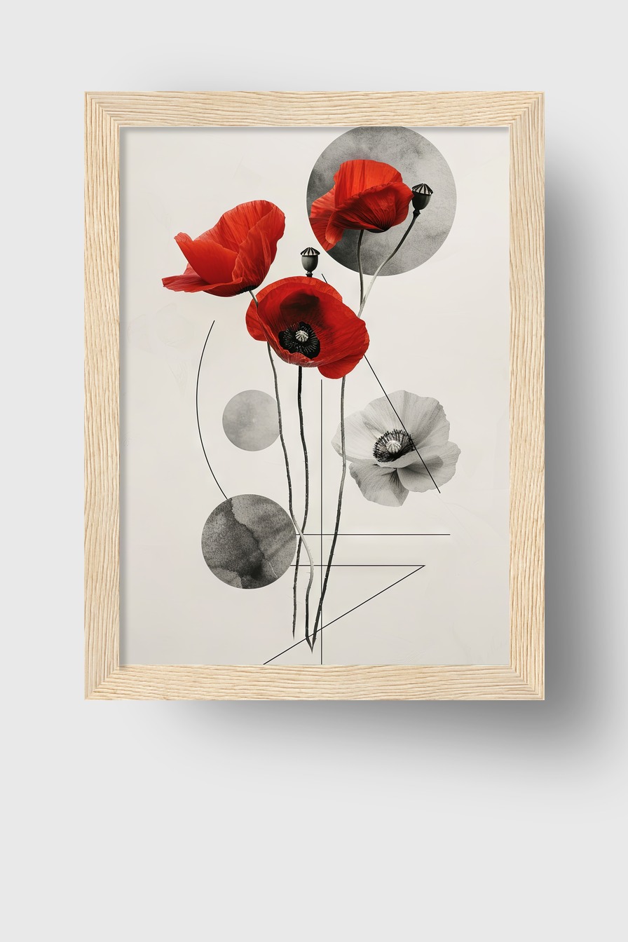 Rote und schwarz-weiße Mohnblumen vor abstrakten Kreisen auf Posterpapier (170 g/m²) mit matter Oberfläche hinter bruchsicherem Plexiglas. Im Kiefernholzrahmen (FSC-zertifiziert), fertig zum Aufhängen.