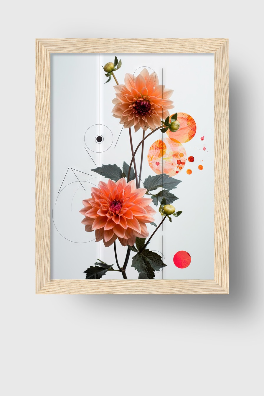 Poster mit Dahlien und grafischen Formen auf 170 g/m² halbmattem FSC-Papier hinter bruchsicherem Plexiglas. Kiefernholzrahmen in Schwarz, Weiß, Naturholz oder Dunkelbraun erhältlich. Fertig zum Aufhängen, inklusive Aufhängeset.