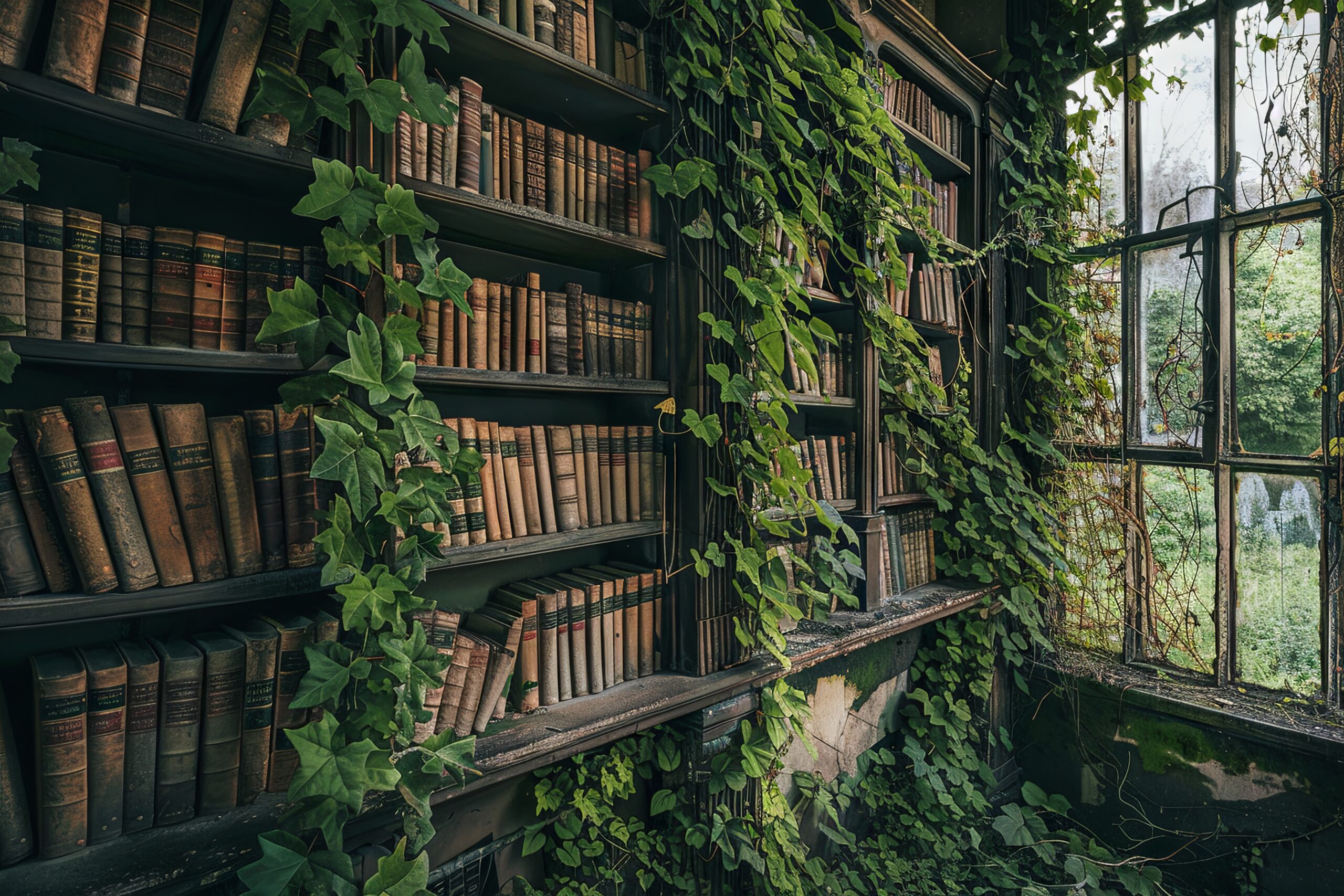 Kunstdruck mit altem Bücherregal überwuchert von grünem Efeu neben großem Fenster, Vintage Stimmung in Grüntönen