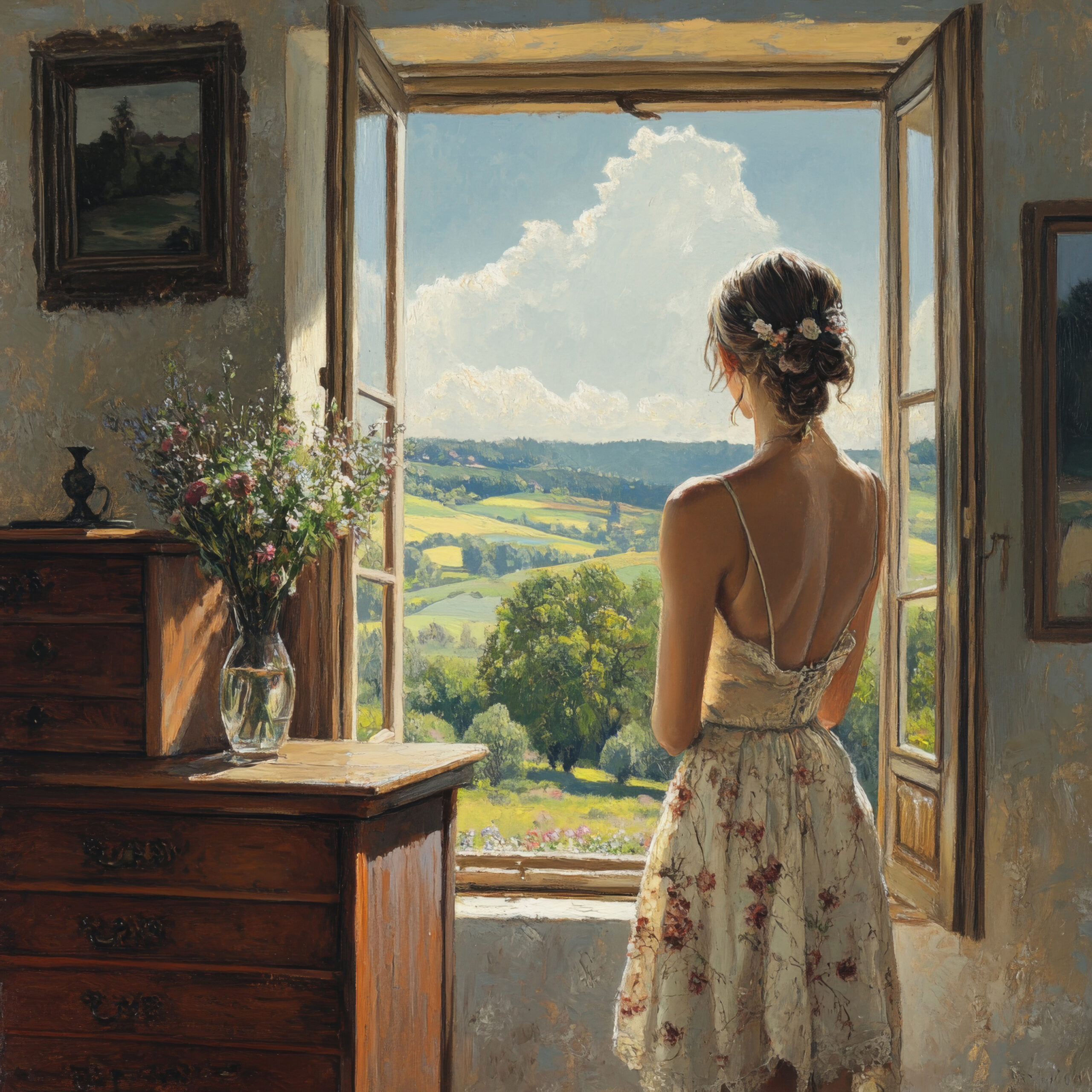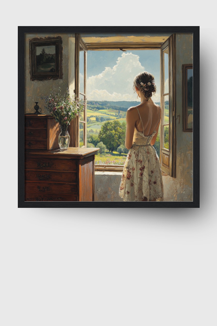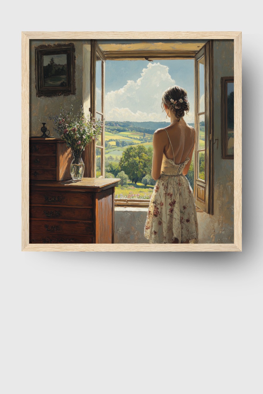 Eine Frau steht in einem zarten Kleid am offenen Fenster und blickt auf eine sonnige Landschaft mit grünen Hügeln. Das Bild verbindet Innenszene mit idyllischem Naturblick.