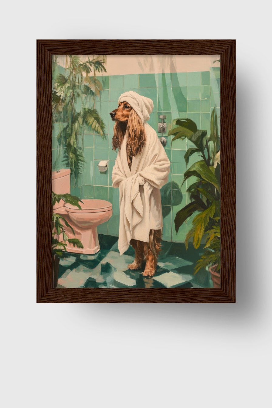 Poster mit realistischer Darstellung eines Hundes im Bademantel in einem Badezimmer mit grünen Fliesen, entspannte Atmosphäre, dekorativer Kunstdruck