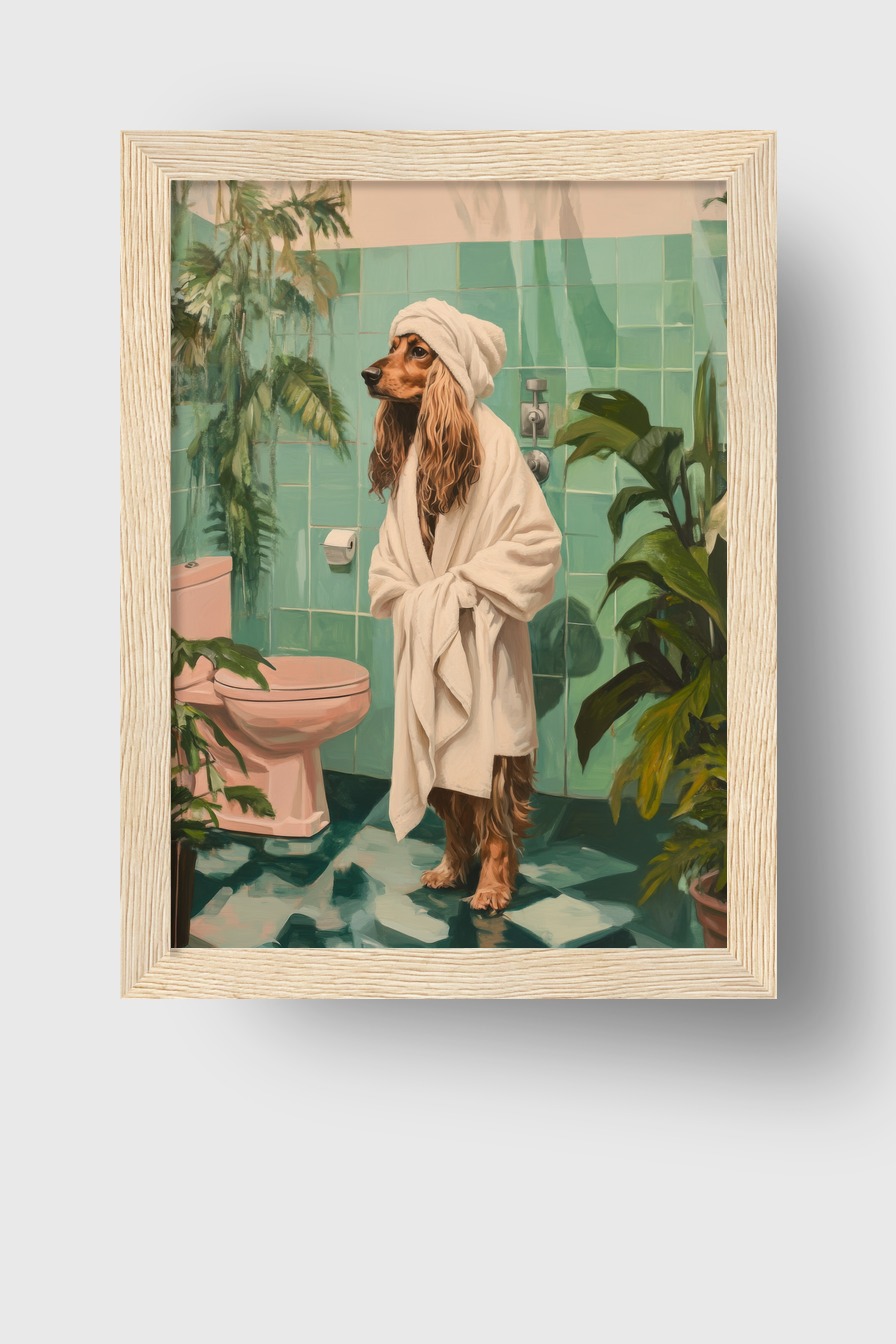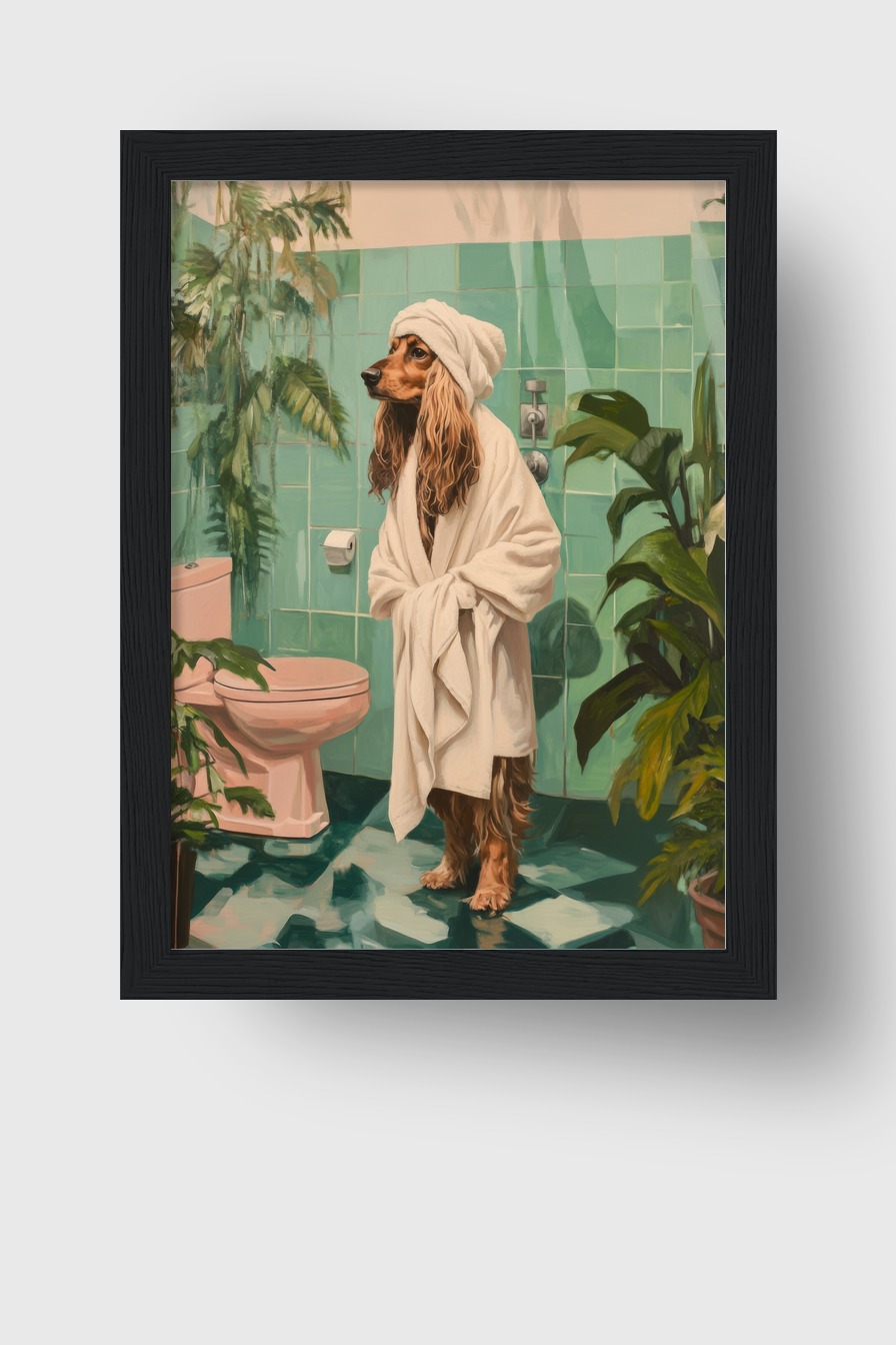 Poster eines Hundes im Bademantel und Handtuchturban vor türkisen Badezimmerfliesen mit Pflanzen