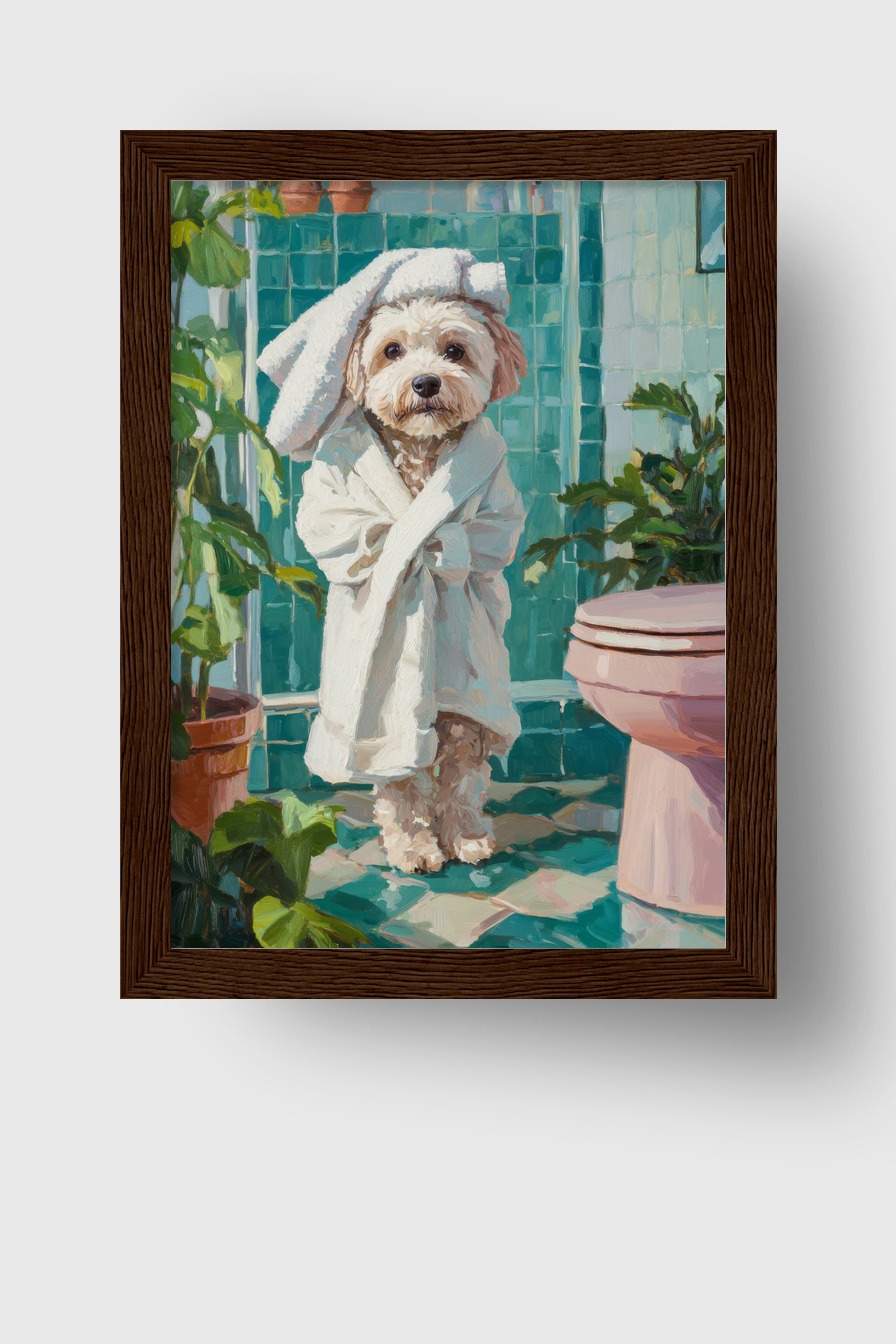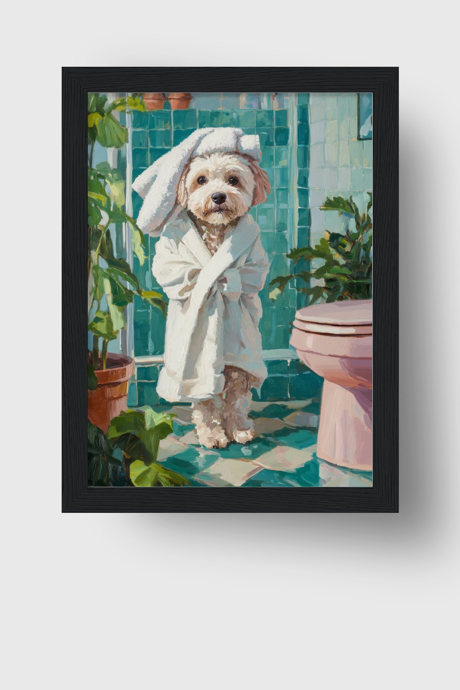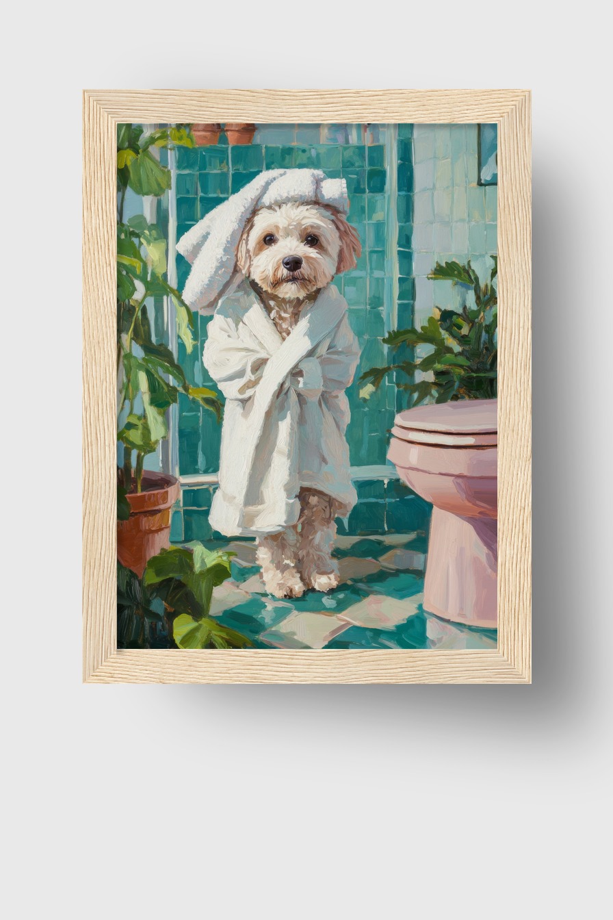 Ein kleiner Hund steht mit Bademantel und Handtuch auf dem Kopf im Bad. Das Bild zeigt eine gemütliche Szene mit grünen Fliesen und vielen Pflanzen.