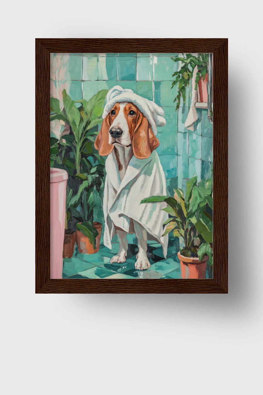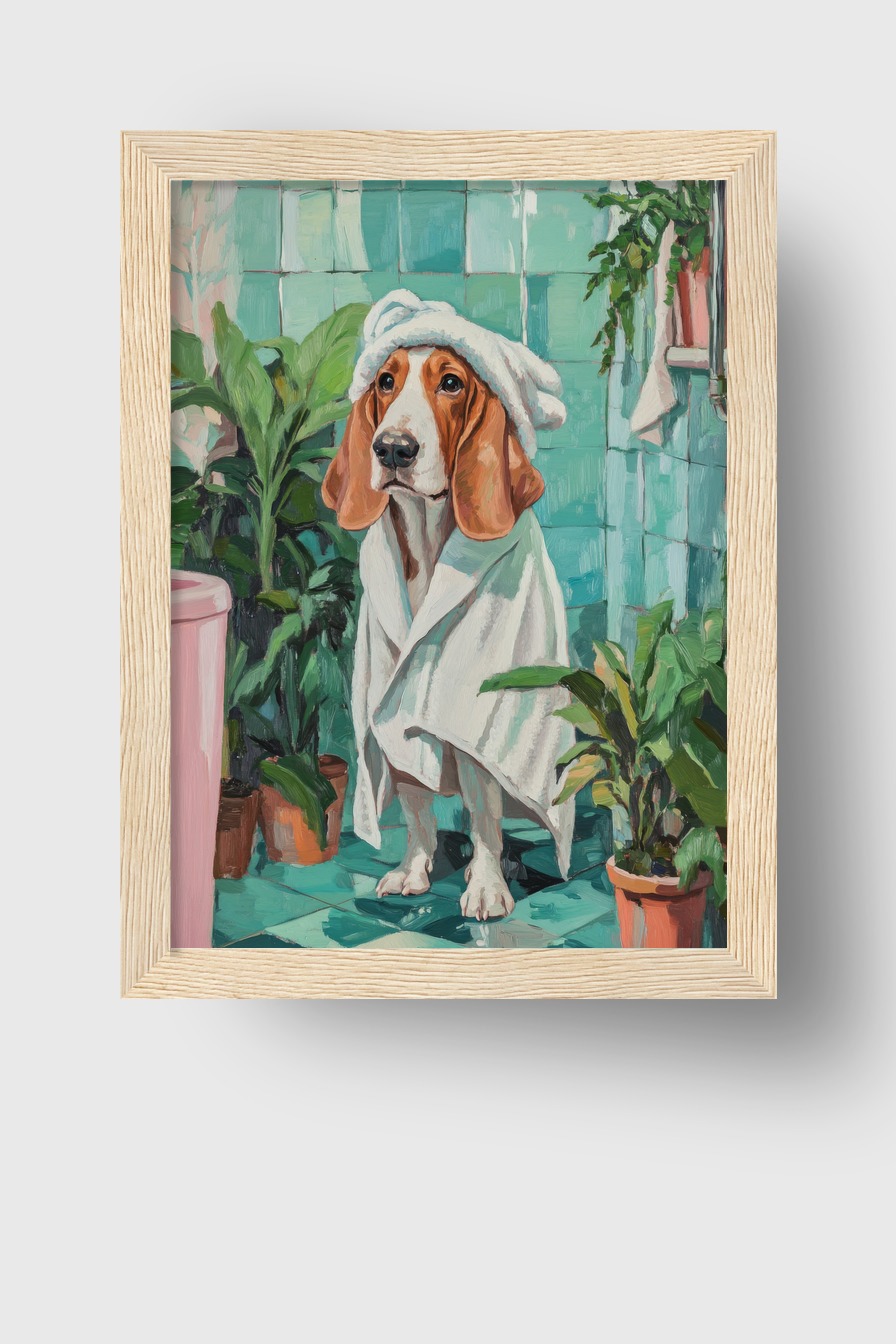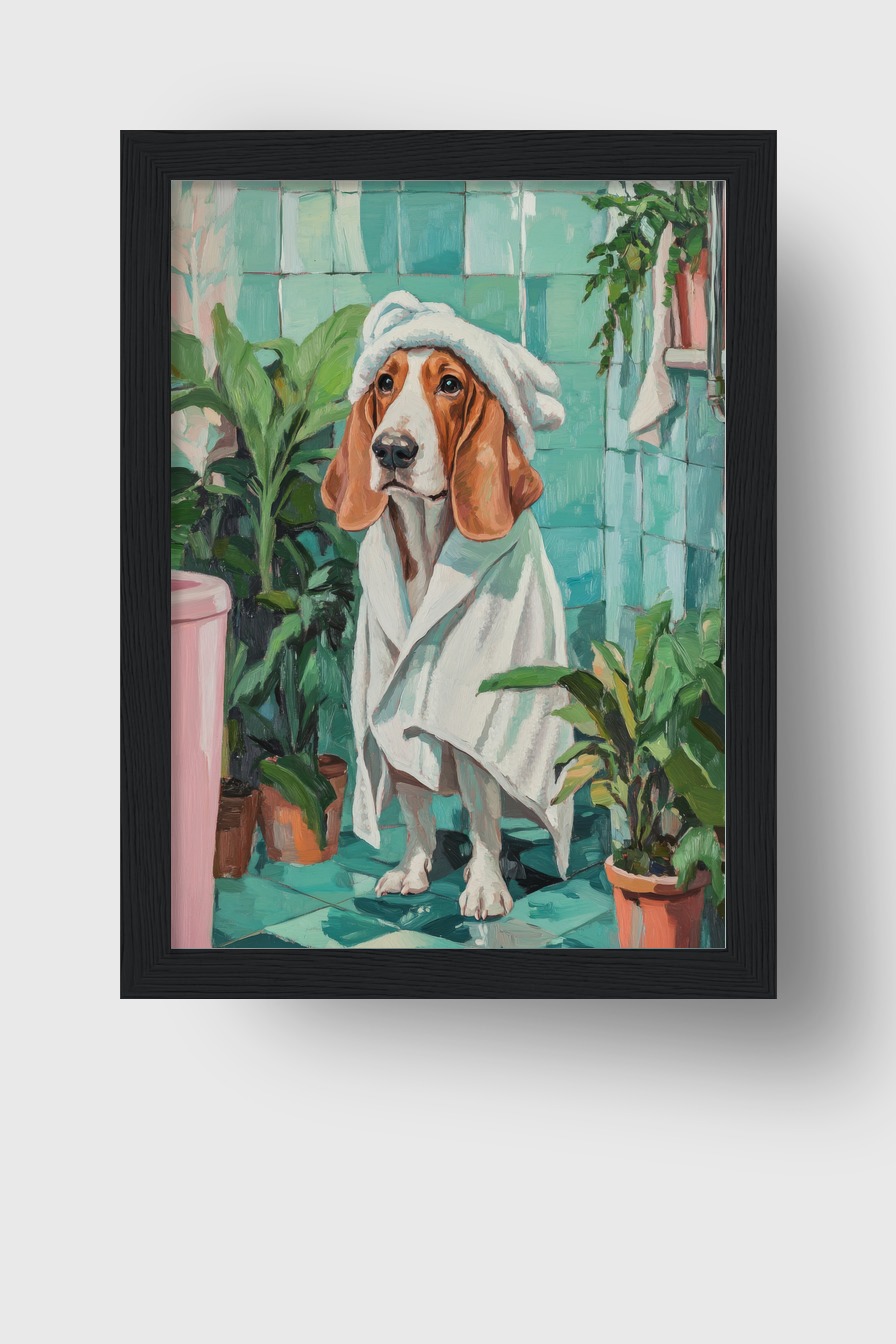 Ein Hund sitzt mit einem Handtuch und Turban auf dem Kopf in einem Badezimmer. Die Szenerie ist von grünen Fliesen und Pflanzen umgeben.
