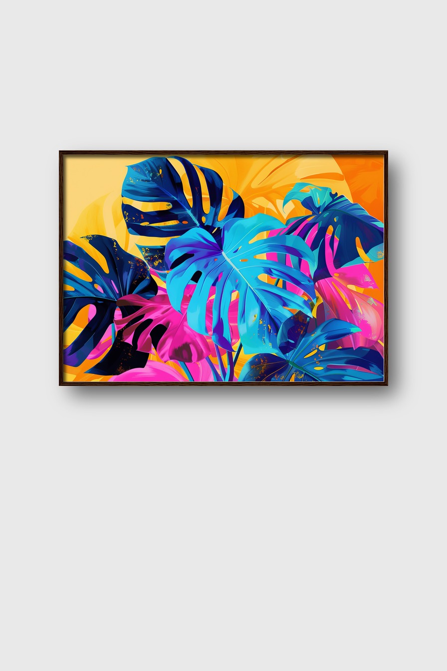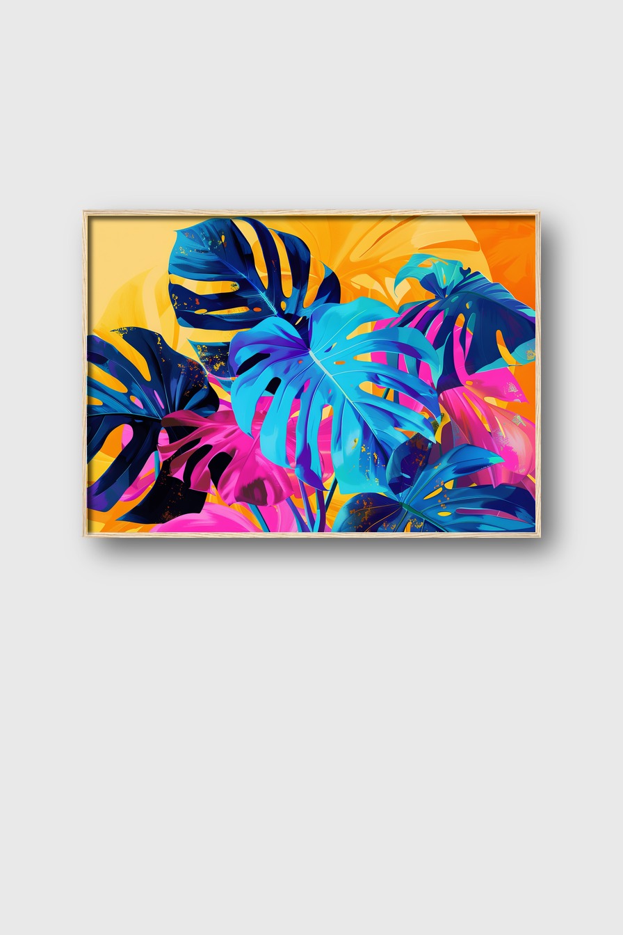 Farbenfrohe Monstera Blätter als Poster auf 170 g/m² halbmatischem Papier hinter bruchsicherem Plexiglas. Kiefernholzrahmen in verschiedenen Farben erhältlich. Inklusive Aufhängeset, fertig zum Aufhängen.