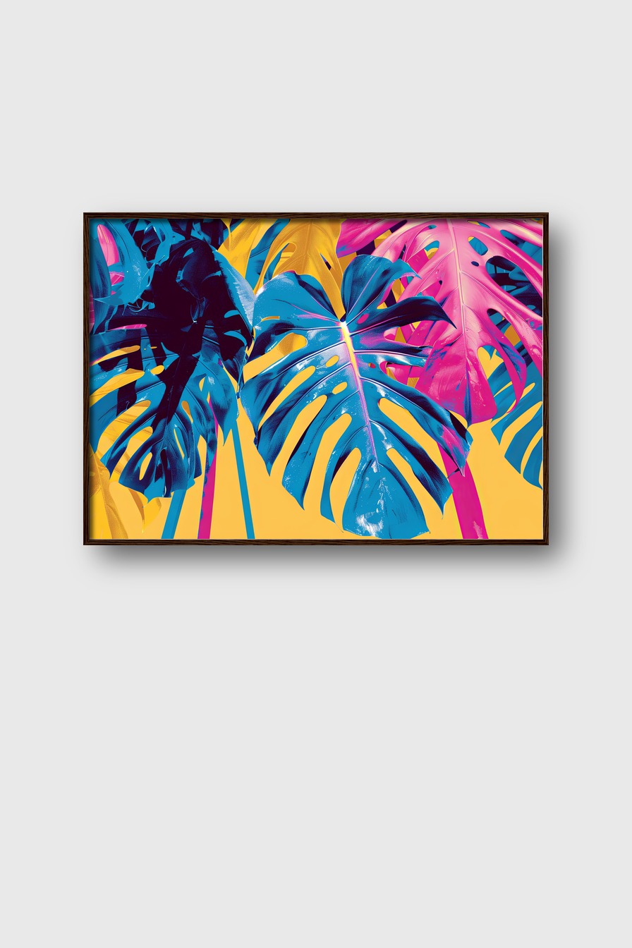 Monstera-Blätter in kräftigen Farben hinter bruchsicherem Plexiglas. Kiefernholzrahmen FSC-zertifiziert. In mehreren Farben verfügbar.