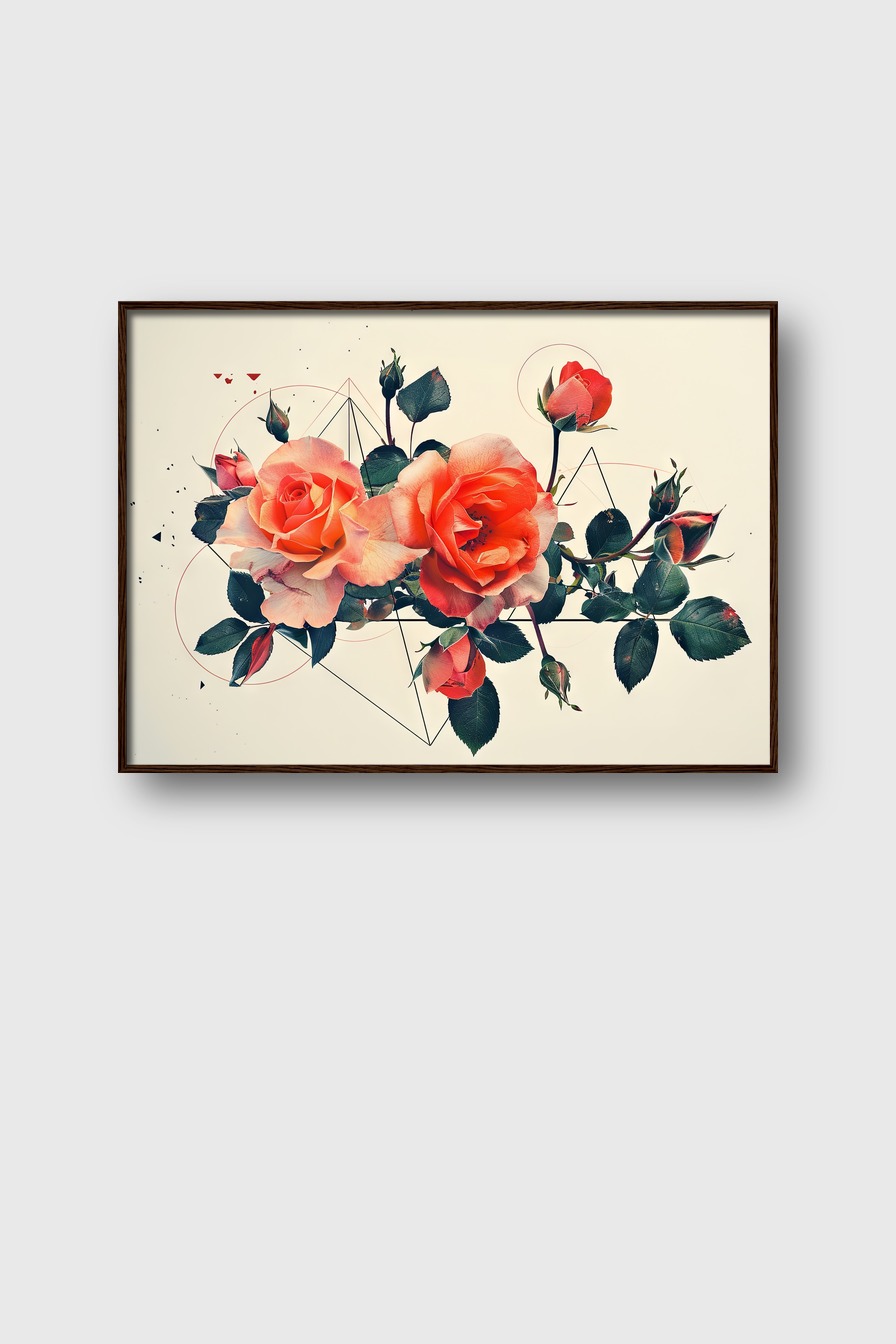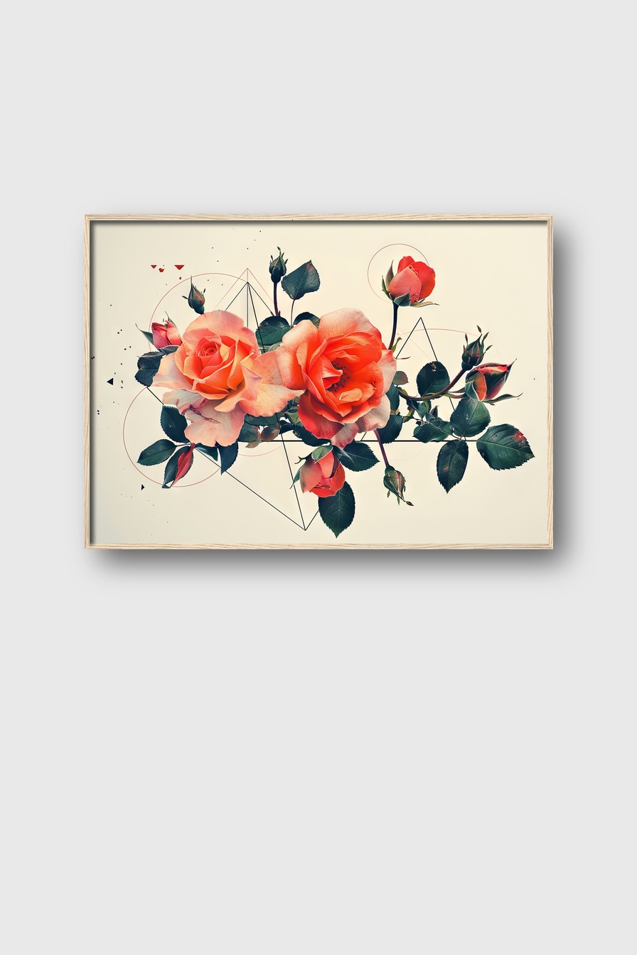 Grafik eines Rosenzweigs mit roten Blüten. Poster (170 g/m², halbmatt) hinter bruchsicherem Plexiglas in FSC-zertifiziertem Kiefernholzrahmen. Fertig zum Aufhängen mit Aufhängeset.